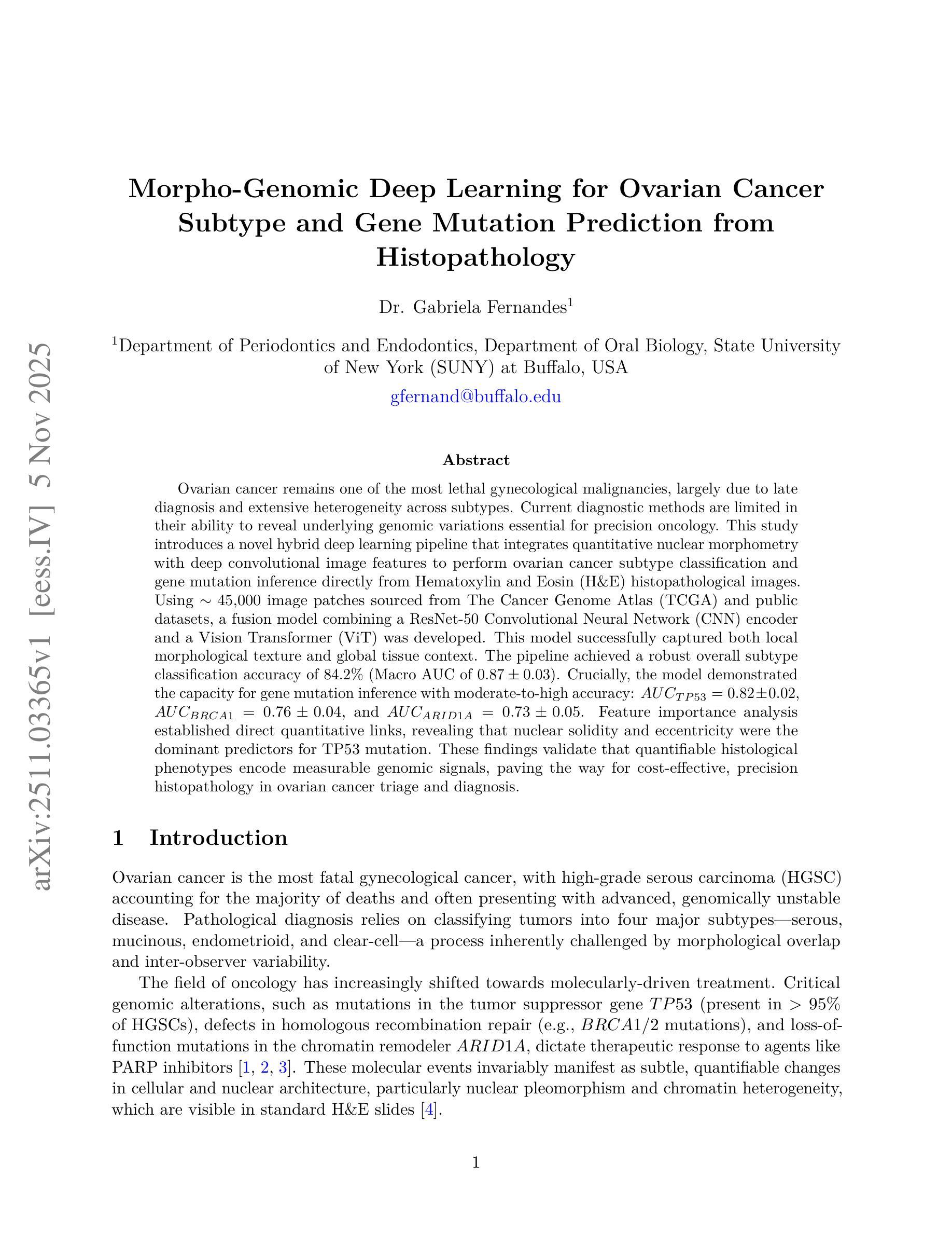 卵巢癌仍是致死率最高的妇科恶性肿瘤之一,这主要是因为诊断时间晚以及各亚型之间的广泛异质性。当前诊断方法在揭示卵巢癌精准医疗所需潜在基因组变异方面的能力受限。本研究介绍了一种新型混合深度学习管道,它将定量核形态测量与深度卷积图像特征相结合,直接从苏木精和伊红(H&E)组织病理图像中执行卵巢癌亚型分类和基因突变推断。该研究使用来自癌症基因组图谱(TCGA)和公共数据集的约45,000个图像块,开发了一个结合ResNet-50卷积神经网络(CNN)编码器和视觉转换器(ViT)的融合模型。该模型成功捕获了局部形态纹理和全局组织上下文。管道实现了稳健的总体亚型分类准确率84.2%(宏观AUC为0.87±0.03)。最重要的是,该模型在基因突变推断方面表现出中等到较高的准确性:AUC_TP53=0.82±0.02,AUC_BRCA1=0.76±0.04和AUC_ARID1A=0.73±0.05。特征重要性分析建立了直接的定量联系,表明核坚固性和离心率是TP53突变的主要预测因子。这些发现证明了可量化的组织病理表型能够编码可测量的基因组信号,为卵巢癌筛查和诊断中的经济高效、精准组织病理学铺平了道路。