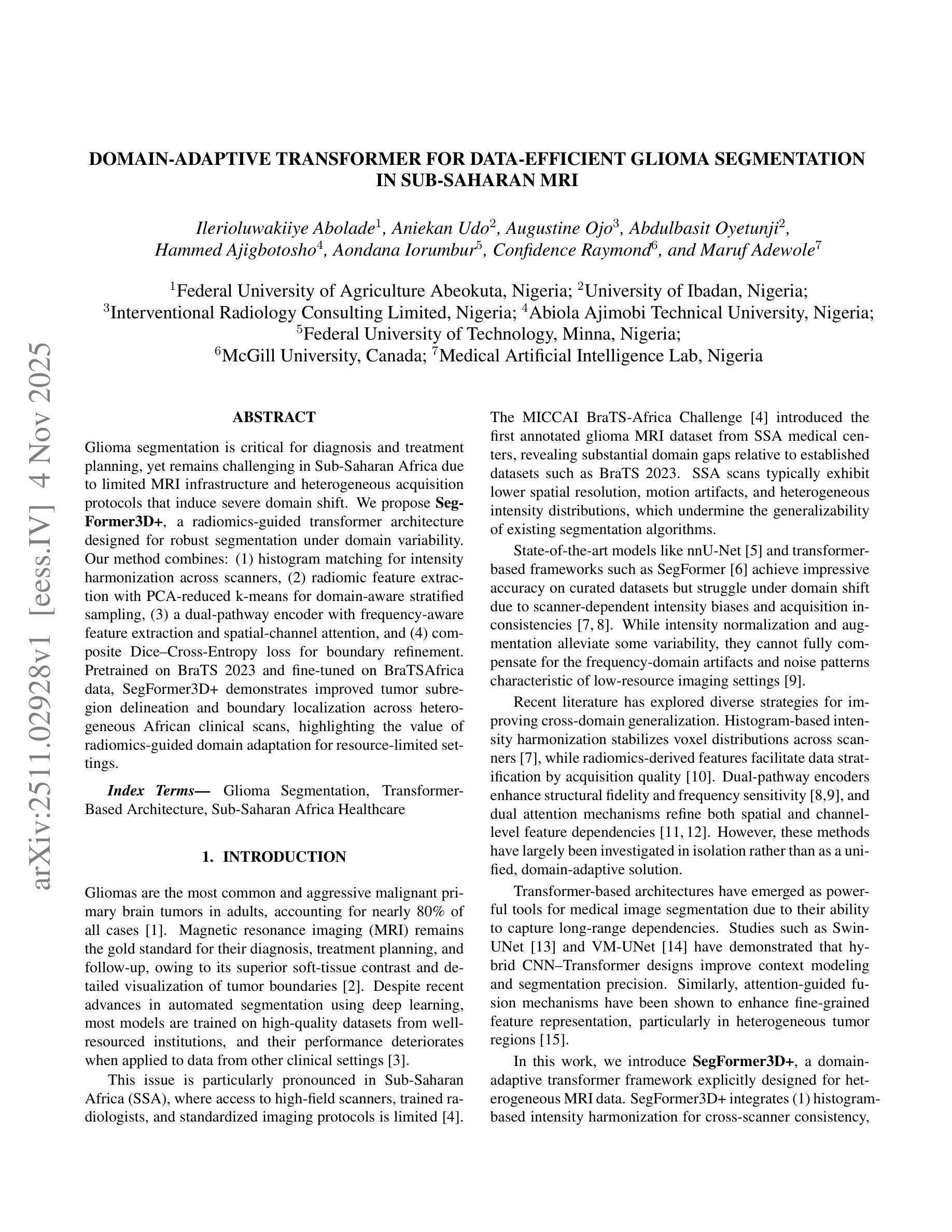 胶质瘤分割对于诊断和治疗计划至关重要,然而在撒哈拉以南非洲仍然是一个挑战,因为有限的MRI基础设施和不同的采集协议导致了严重的领域偏移。我们提出了SegFormer3D-plus,这是一种基于放射学指导的转换器架构,旨在在领域变化下进行稳健的分割。我们的方法结合了:(1)直方图匹配,用于扫描仪之间的强度协调,(2)使用PCA降维的k均值进行放射学特征提取,以实现领域感知分层采样,(3)具有频率感知特征提取和空间通道注意力的双路径编码器,(4)复合Dice-Cross-Entropy损失以优化边界。在BraTS 2023上进行预训练并在BraTS-Africa数据上进行微调后,SegFormer3D-plus展示了在非洲的临床扫描图像中改善肿瘤亚区域分割和边界定位的能力,这突出了在资源受限环境中放射学指导的领域适应的价值。