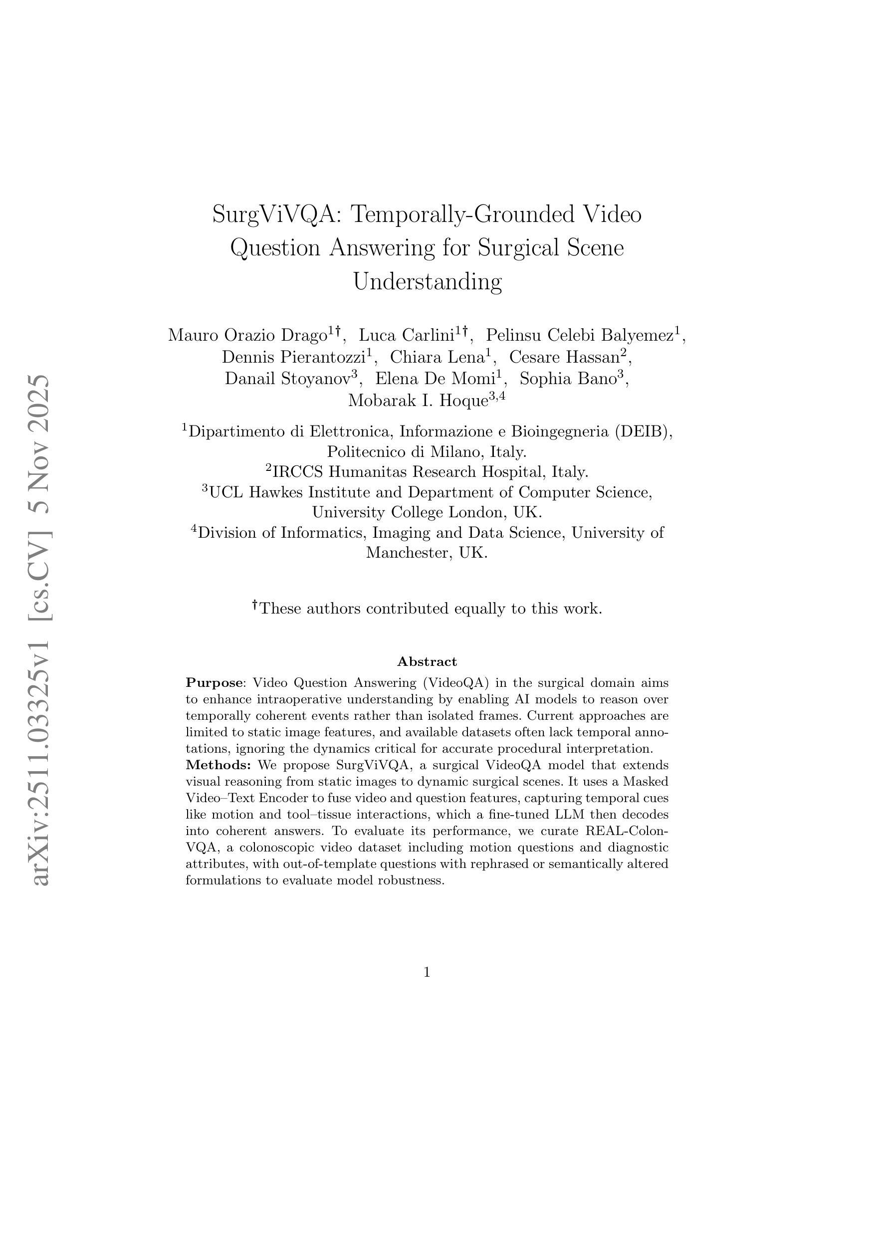 手术领域的视频问答(VideoQA)旨在通过使AI模型能够对时间连贯的事件进行推理,而不是孤立的帧,从而提高手术过程中的理解。当前的方法仅限于静态图像特征,而可用的数据集通常缺乏时间注释,忽略了对于准确程序解释至关重要的动态。我们提出了SurgViVQA,一个手术视频问答模型,它将视觉推理从静态图像扩展到动态手术场景。它使用遮罩视频文本编码器融合视频和问题特征,捕捉如运动和工具-组织交互等时间线索,然后经过微调的大型语言模型(LLM)将这些线索解码为连贯的答案。为了评估其性能,我们整理了REAL-Colon-VQA,这是一个结肠镜视频数据集,包括与运动相关的问题和诊断属性,以及重新表述或语义更改的模板外问题,以评估模型的稳健性。在REAL-Colon-VQA和公共EndoVis18-VQA数据集上的实验验证表明,SurgViVQA优于现有的基于图像的VQA基准模型,特别是在关键词准确率方面,在REAL-Colon-VQA上比PitVQA高出11%,在EndoVis18-VQA上高出9%。对问题进行扰动研究进一步证实了其在问题表述变化中的通用性和稳健性。SurgViVQA和REAL-Colon-VQA数据集为手术视频问答中的时间感知理解提供了框架,使AI模型能够更有效地解释动态程序上下文。代码和数据集可在https://github.com/madratak/SurgViVQA找到。
