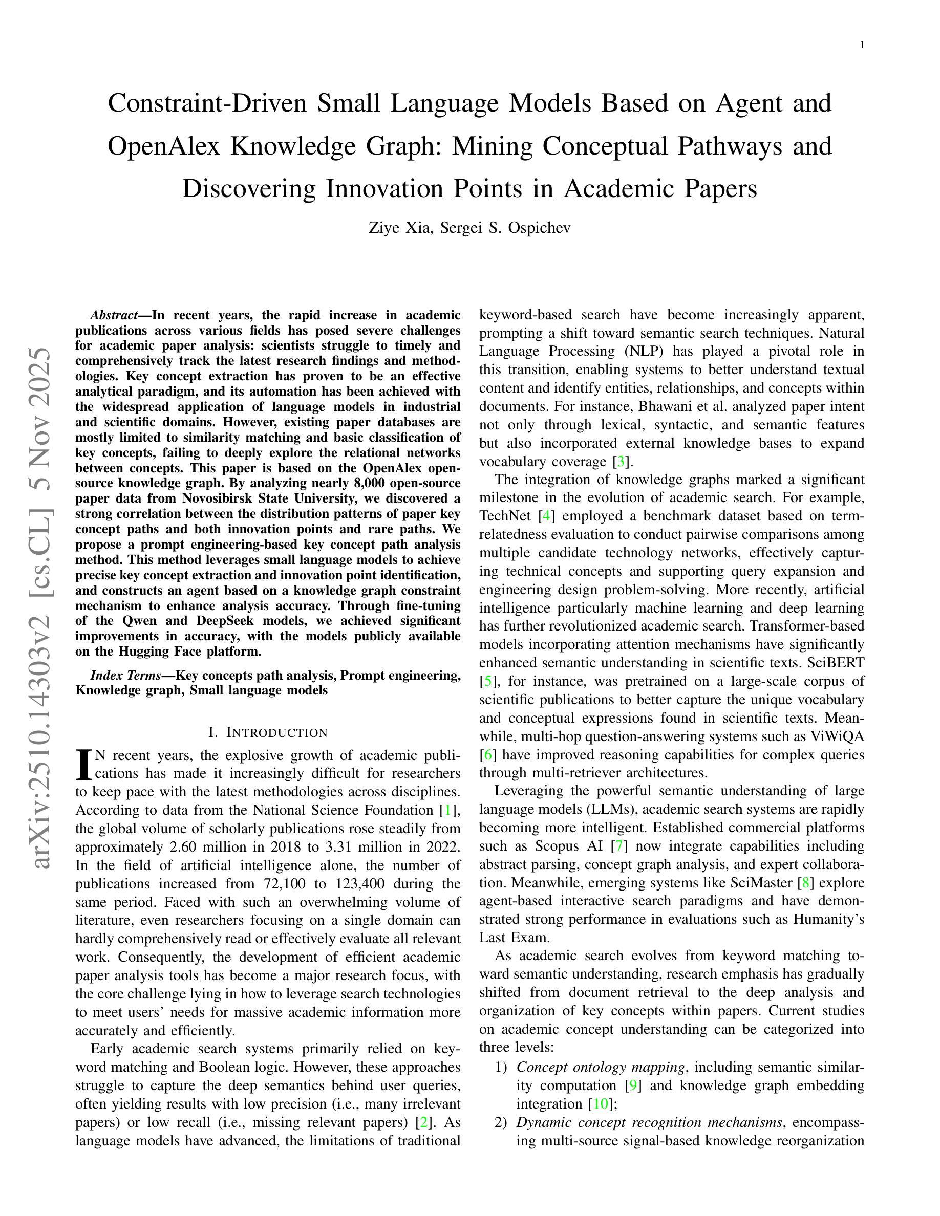 学术出版物数量的急剧增长为学术分析带来了严峻挑战。本文利用OpenAlex开源知识图谱,通过分析Novosibirsk州立大学近8000篇开源论文数据,发现论文关键概念路径分布与创新点和罕见路径之间存在强相关性。提出了一种基于提示工程的关键概念路径分析方法,利用小型语言模型进行精确的关键概念提取和创新点识别,构建基于知识图谱约束机制的代理,以提高分析准确性。通过对Qwen和DeepSeek模型的微调,实现了准确性的显著提高。