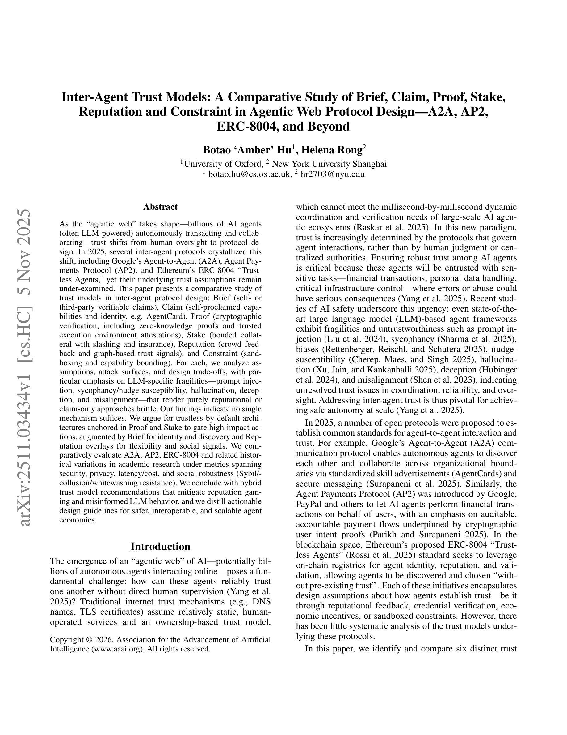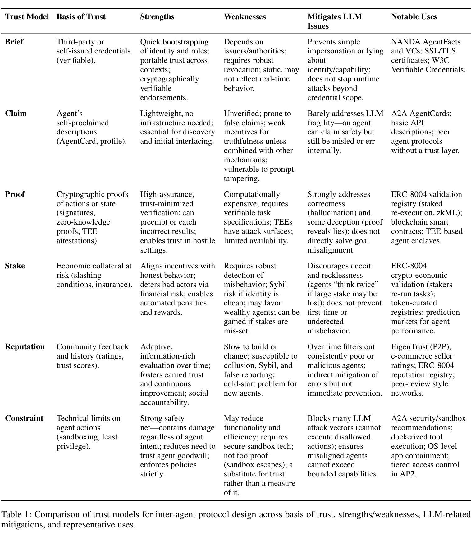 随着“代理网络”的逐渐形成——数十亿的人工智能代理(通常是由大型语言模型驱动的)进行自主交易和协作——信任从人类监督转向协议设计。2025年,几个代理间协议巩固了这一转变,包括谷歌的代理间协议(A2A)、代理支付协议(AP2)和以太坊的ERC-8004“无信任代理”,但它们的基本信任假设仍然没有得到充分研究。本文比较研究了代理协议设计中的信任模型,包括简要(自我或第三方可验证的主张)、声明(自称的能力和身份,例如AgentCard)、证明(加密验证,包括零知识证明和受信任的执行环境认证)、质押(有担保的抵押品与斩首和保险)、声誉(基于群体反馈和图谱的信任信号)和约束(沙箱和能教限制)。我们对每种信任模型分析假设、攻击面和设计权衡,特别是大型语言模型特定的脆弱性,如提示注入、顺从/易受引导影响、幻想、欺骗和不对齐等,这些导致纯粹的声誉或仅声明的做法很脆弱。我们的研究结果表明,没有任何单一的机制足以应对。我们主张以证明和质押作为默认无信任架构的锚点来限制高风险行为,辅以简要身份和发现以及声誉叠加以实现灵活性和社会信号。我们根据安全、隐私、延迟/成本和社会稳健性(对抗Sybil攻击、勾结、洗白)等指标对A2A、AP2、ERC-8004及相关学术研究进行横向比较评估。我们得出结论,提出混合信任模型建议,缓解声誉游戏和误导的大型语言模型行为,并提炼出可操作的设计指南,以实现更安全、更互通、更可扩展的代理经济。