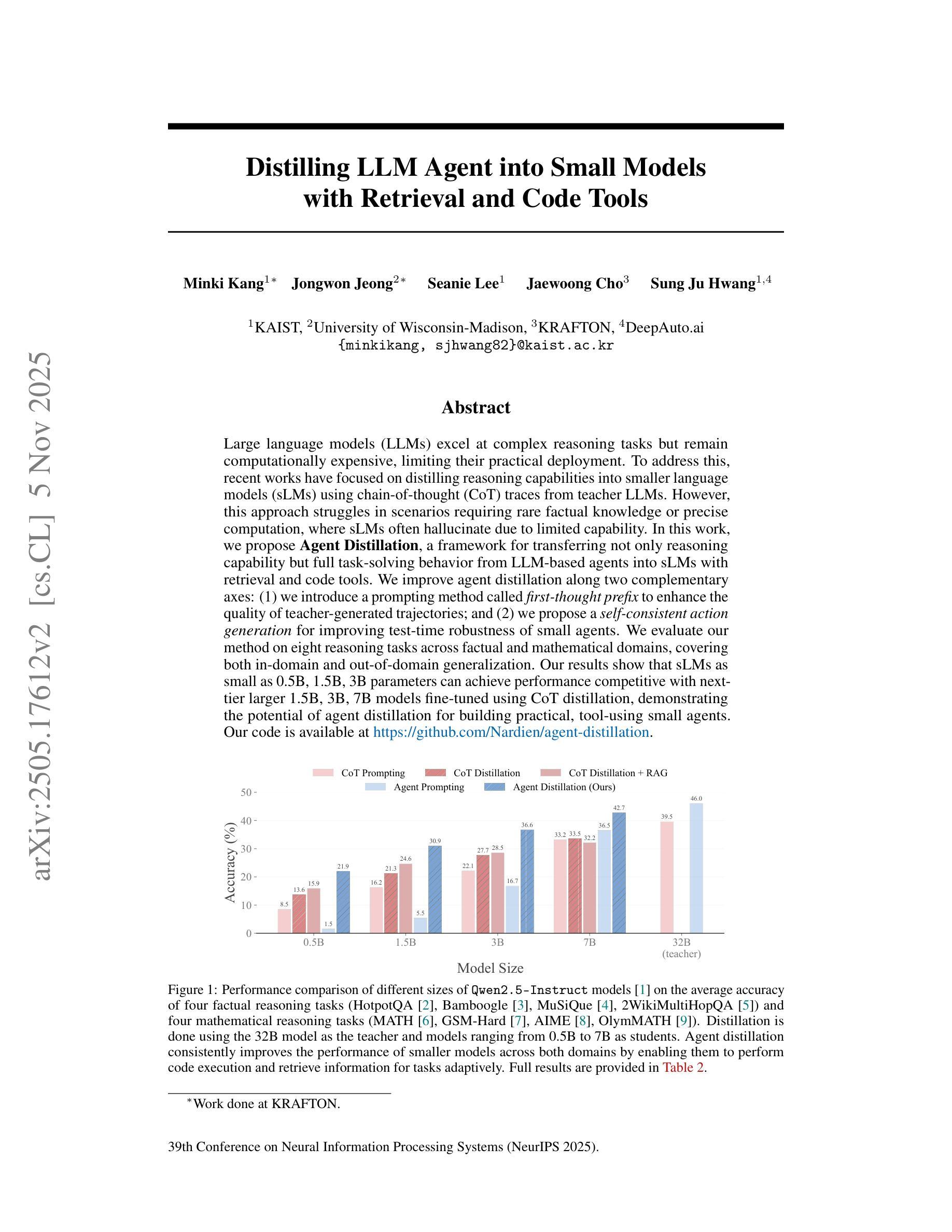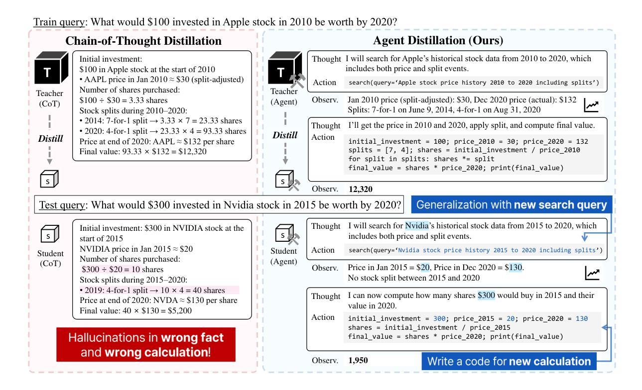 大语言模型在复杂推理任务上表现出色,但计算成本高昂,限制了其实践部署。为解决这个问题,近期研究致力于将推理能力蒸馏到小型语言模型中,利用教师大语言模型的思维链(CoT)轨迹。然而,在需要罕见事实知识或精确计算等场景中,此方法常常出现幻想,因小型模型的局限性所致。本研究提出Agent Distillation框架,不仅转移推理能力,而且转移基于语言模型的任务解决行为,结合检索和代码工具。我们沿两个互补方向改进agent distillation:(1)引入名为first-thought prefix的提示方法,提高教师生成的轨迹质量;(2)提出自我一致的行动生成,提高小型代理的测试时间稳健性。我们在事实和数学领域的八个推理任务上评估了我们的方法,涵盖域内和域外泛化。结果表明,仅0.5B、1.5B、3B参数的小型模型即可实现与采用CoT蒸馏微调的大型模型相近的性能,显示出agent distillation在构建实用、使用工具的小型模型方面的潜力。