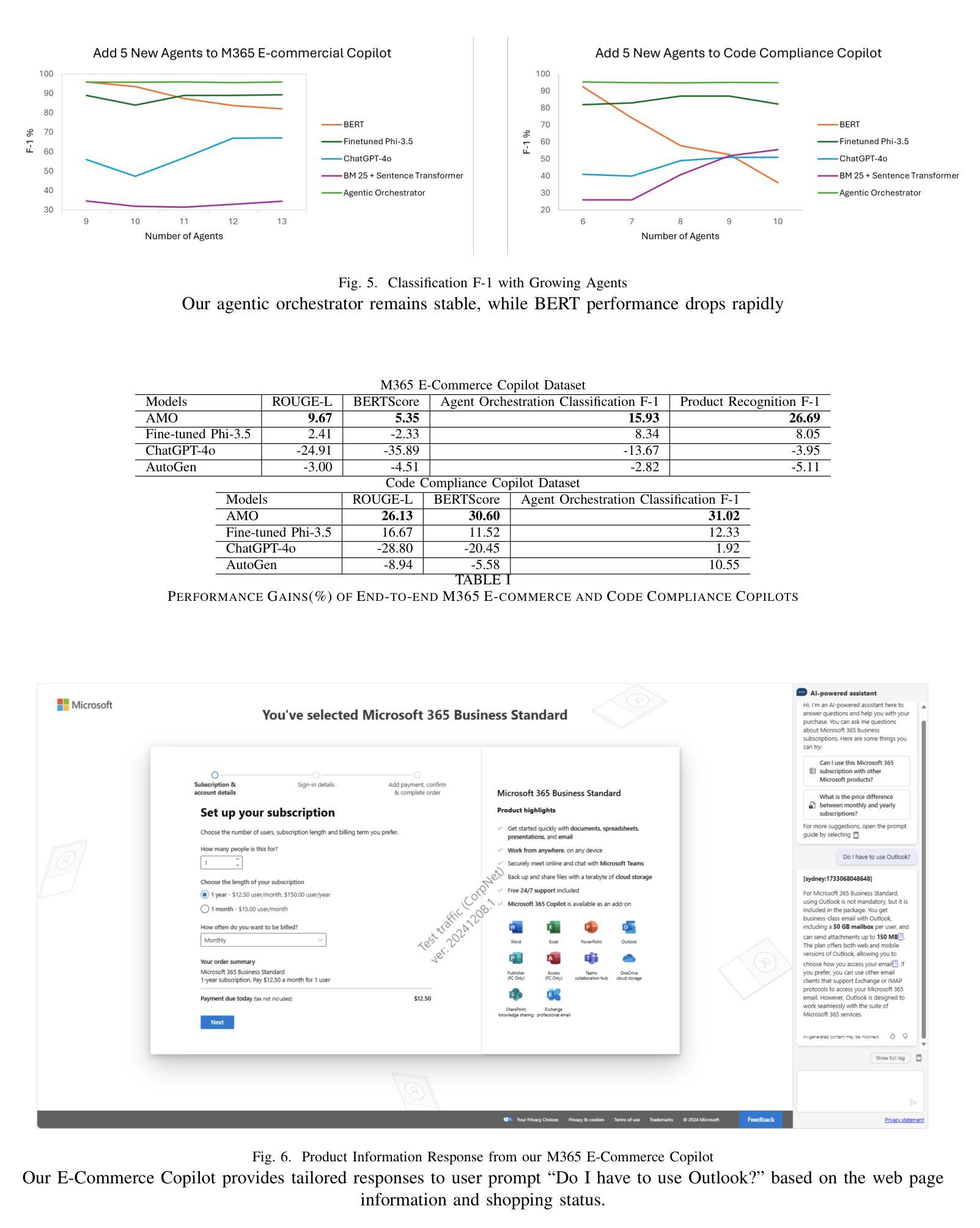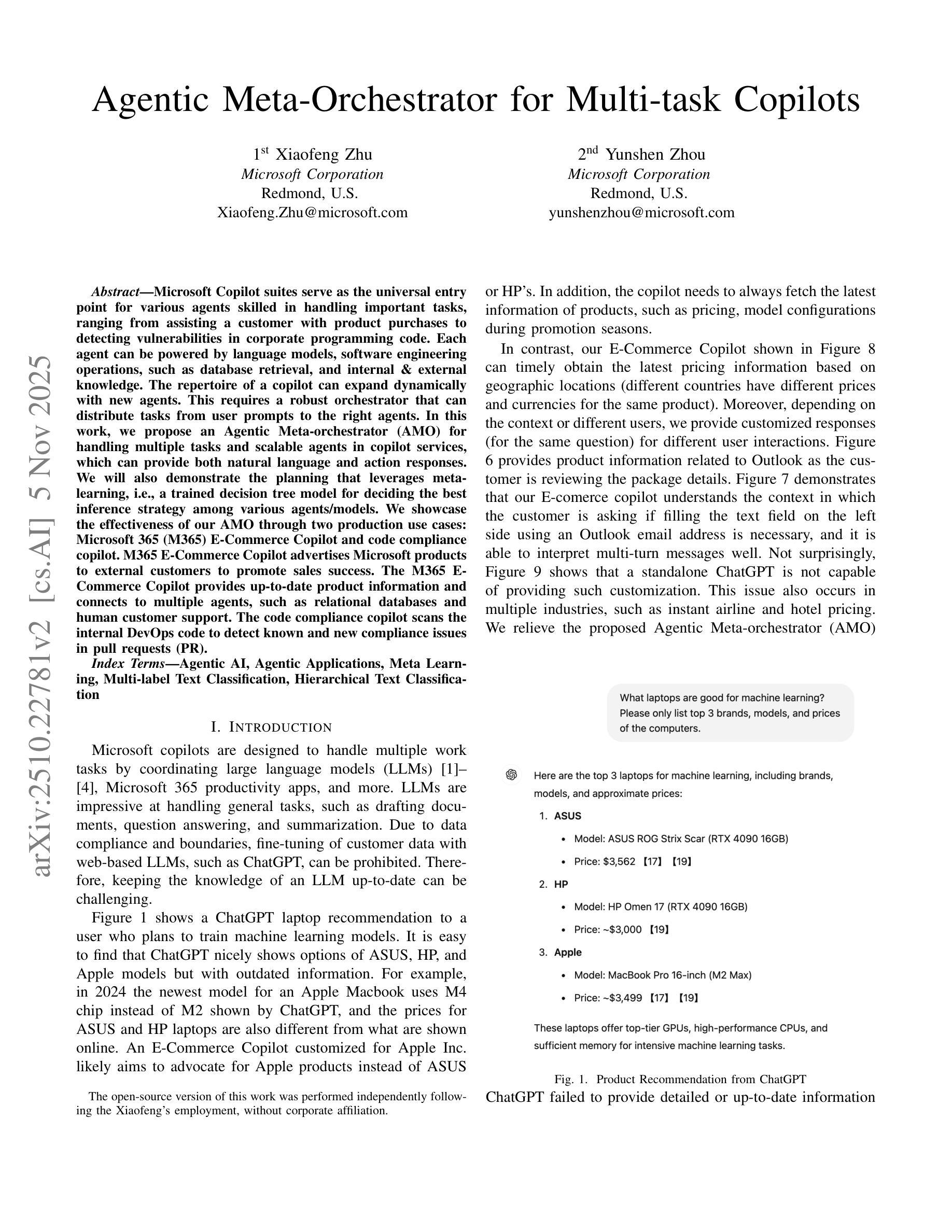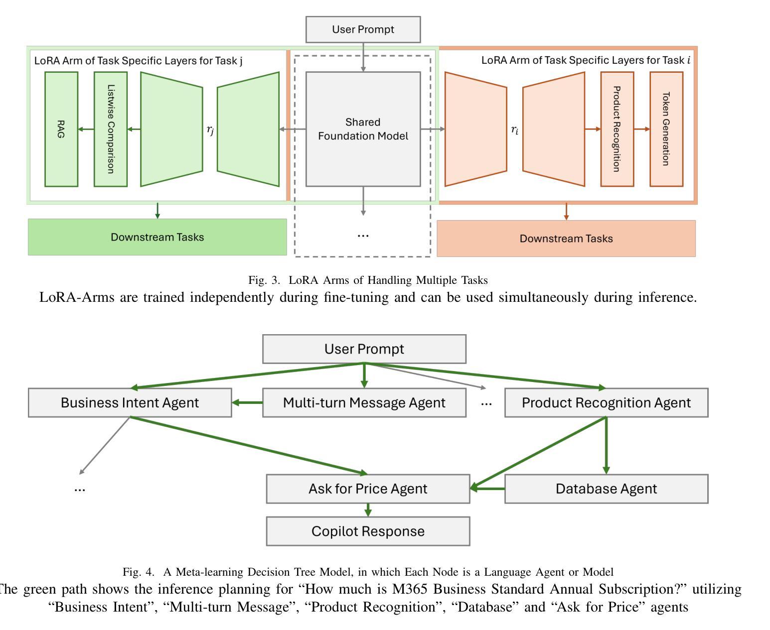 微软Copilot套件作为各种处理重要任务的智能代理人的通用入口点,从帮助客户购买产品到检测企业编程代码中的漏洞。每个代理人都可借助语言模型、数据库检索等软件工程操作和内部和外部知识来赋能。Copilot的招式可以随着新代理人的加入而动态扩展。这需要一个强大的编排器,能够将用户提示的任务分配给合适的代理人。在此工作中,我们提出了一种Agentic元编排器(AMO)来应对Copilot服务中的多任务处理和可扩展的代理人,它既能提供自然语言又能提供行动回应。我们还将展示利用元学习的规划方法,即训练决策树模型来决定在各种代理人/模型之间选择最佳的推理策略。我们通过两个生产用例来展示AMO的有效性:Microsoft 365(M365)电子商务Copilot和代码合规Copilot。M365电子商务Copilot向外部客户宣传微软产品,以促进销售成功。M365电子商务Copilot提供最新的产品信息,并与多个代理人相连,如关系数据库和人类客户支持。代码合规Copilot扫描内部DevOps代码,以检测拉取请求中的已知和新合规问题。