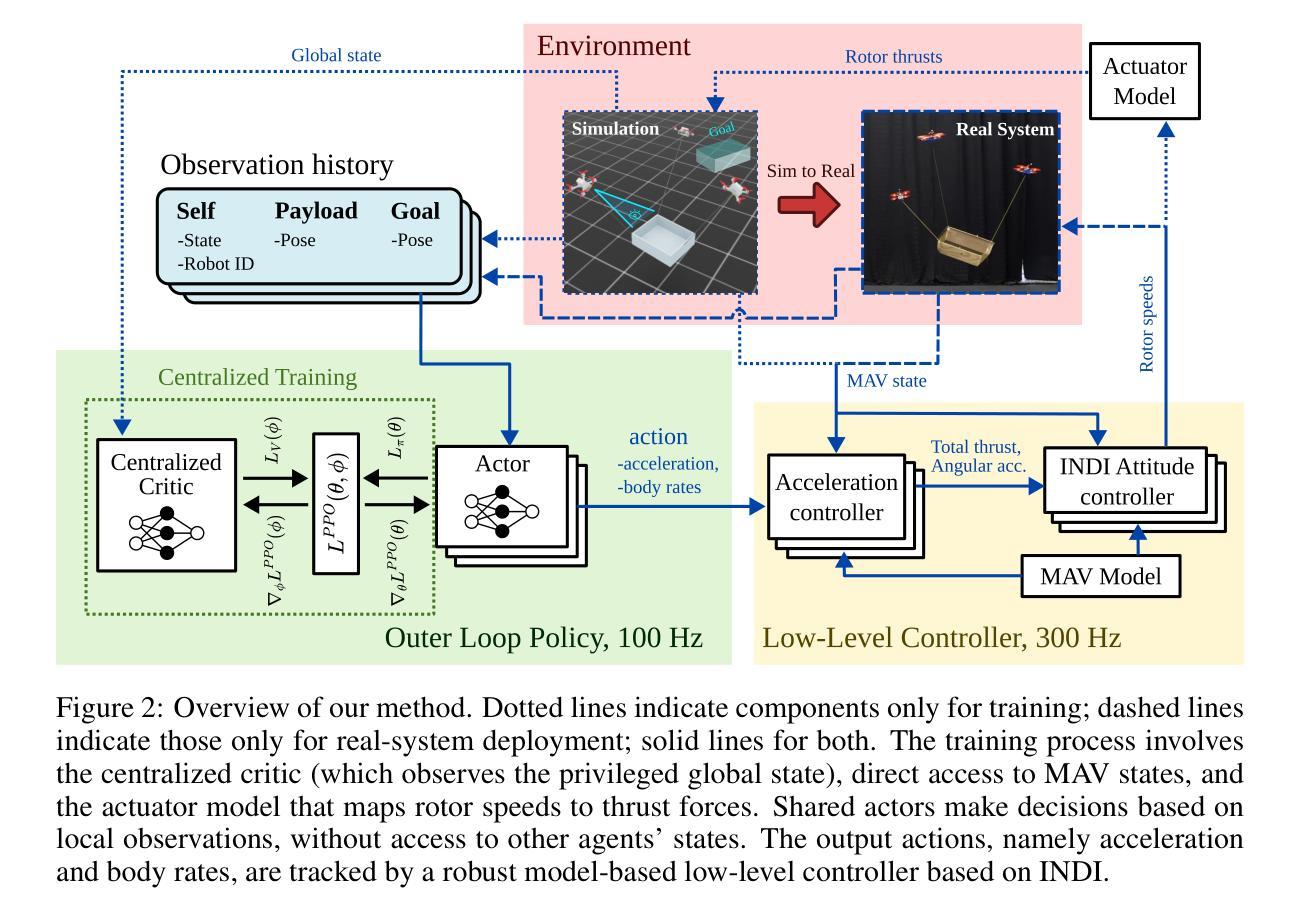 - 无需全局状态、智能体间通信或邻近信息,通过负载姿态观测进行隐性通信。