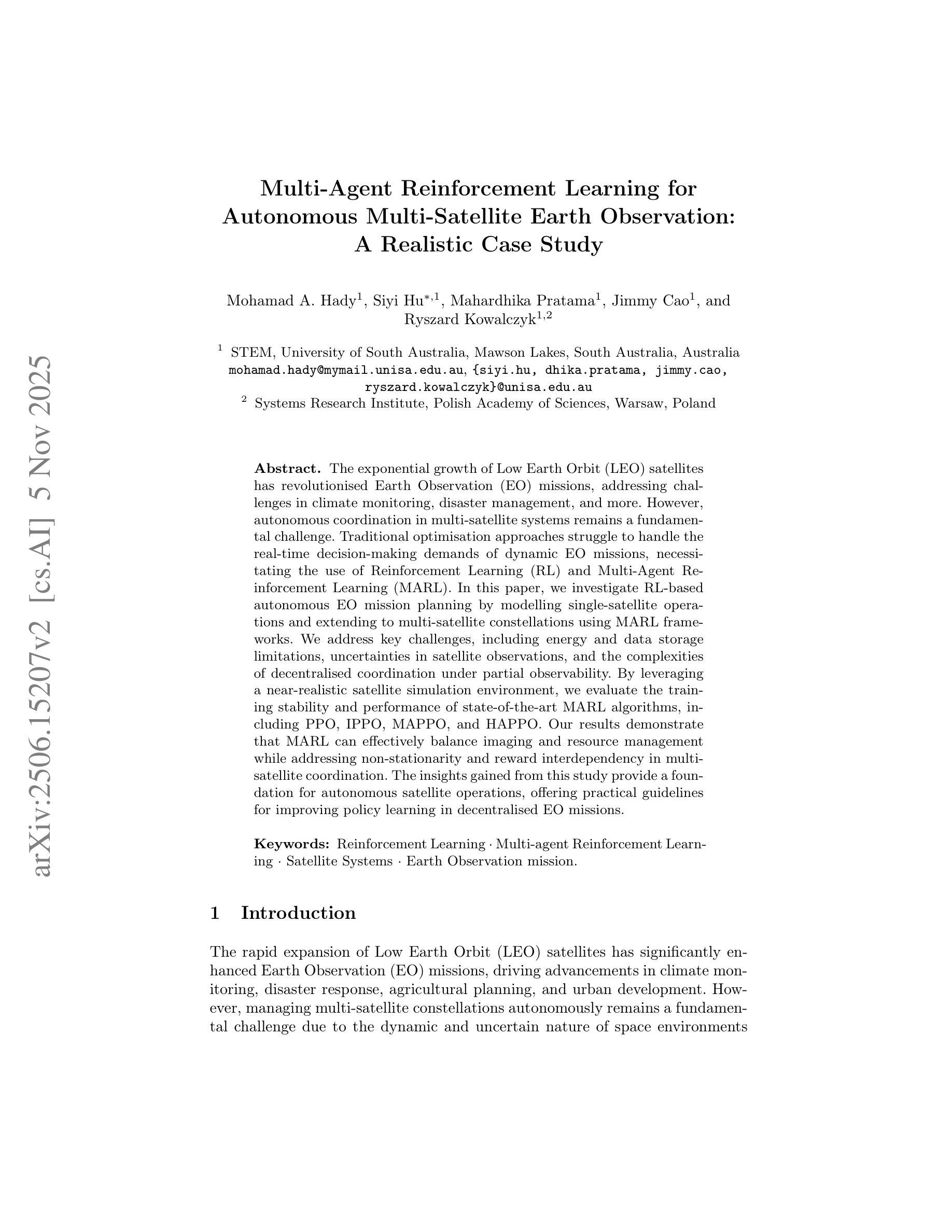 低地球轨道(LEO)卫星的指数级增长已经彻底改变了地球观测(EO)任务,解决了气候监测、灾害管理等领域的挑战。然而,多卫星系统中的自主协调仍然是一个基本挑战。传统优化方法难以满足动态地球观测任务实时决策的需求,需要使用强化学习(RL)和多智能体强化学习(MARL)。本文研究了基于强化学习的自主地球观测任务规划,通过建模单卫星操作,并利用多智能体强化学习框架扩展到多卫星星座。我们解决了关键挑战,包括能源和数据存储限制、卫星观测的不确定性以及在部分观测下的分散协调的复杂性。通过利用近乎真实的卫星仿真环境,我们评估了最新MARL算法的训练稳定性和性能,包括PPO、IPPO、MAPPO和HAPPO。我们的结果表明,MARL可以有效地平衡成像和资源管理,同时解决多卫星协调中的非平稳性和奖励互依赖性。本研究所获得的见解为自主卫星操作提供了基础,为改进分散式地球观测任务中的政策学习提供了实用指南。