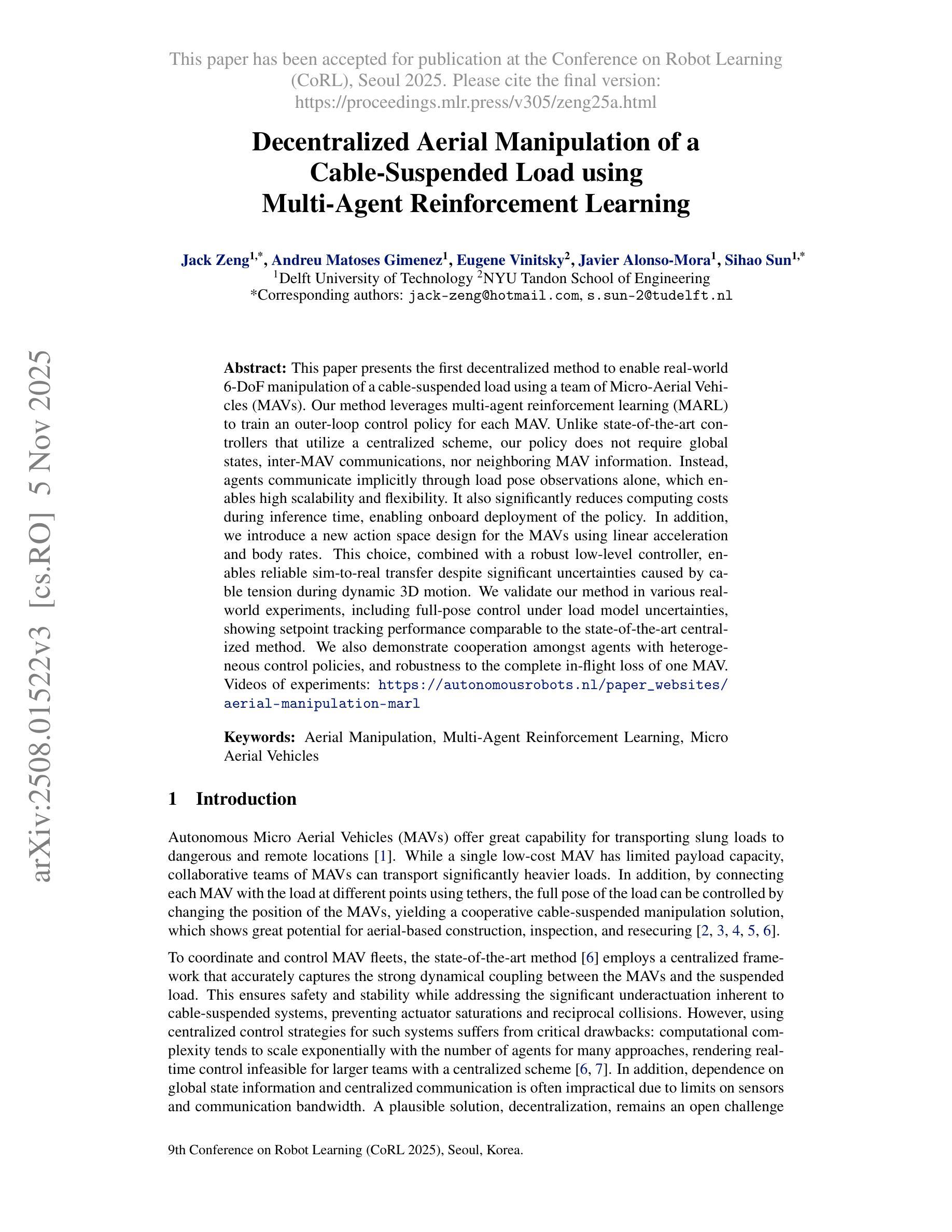 - 提出了一种去中心化的方法实现真实世界中的电缆悬挂负载操控。