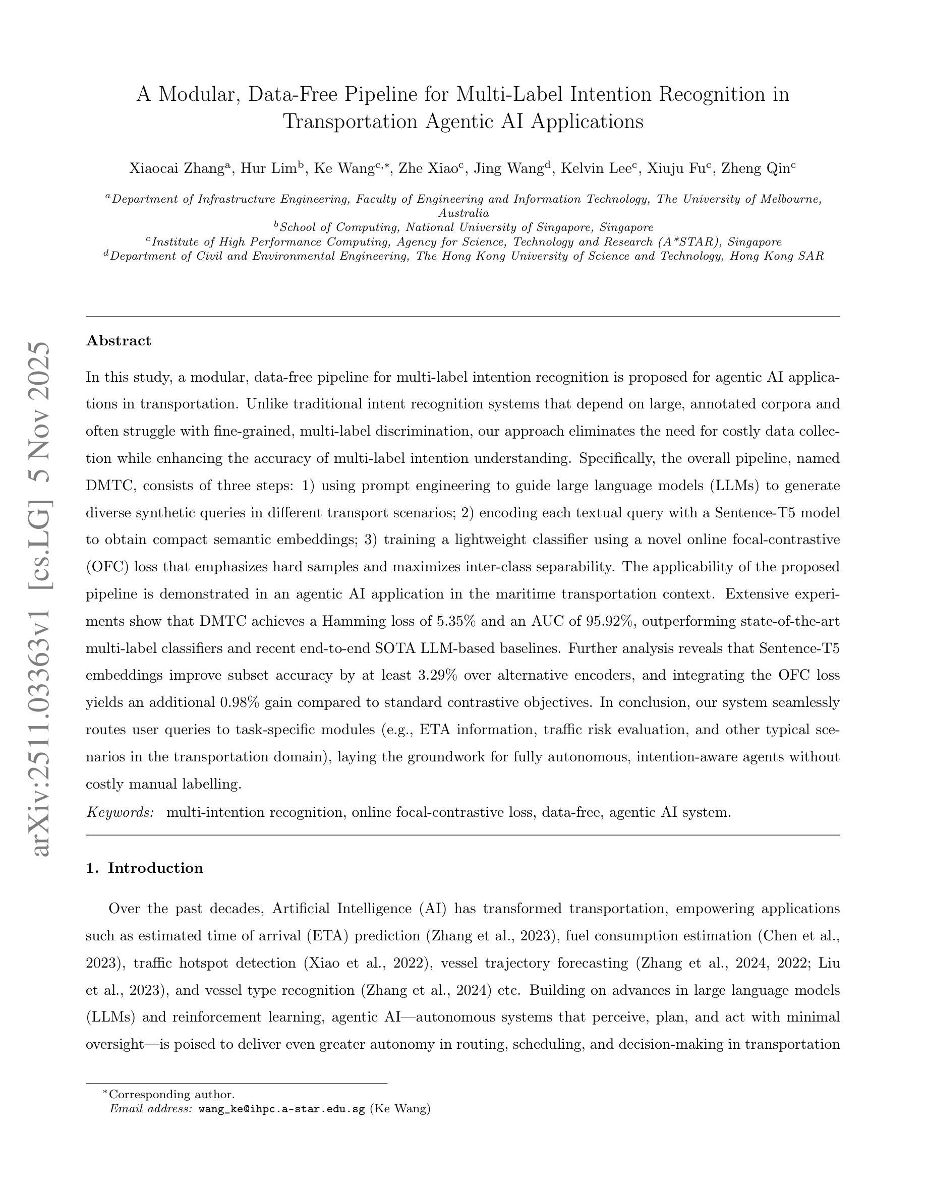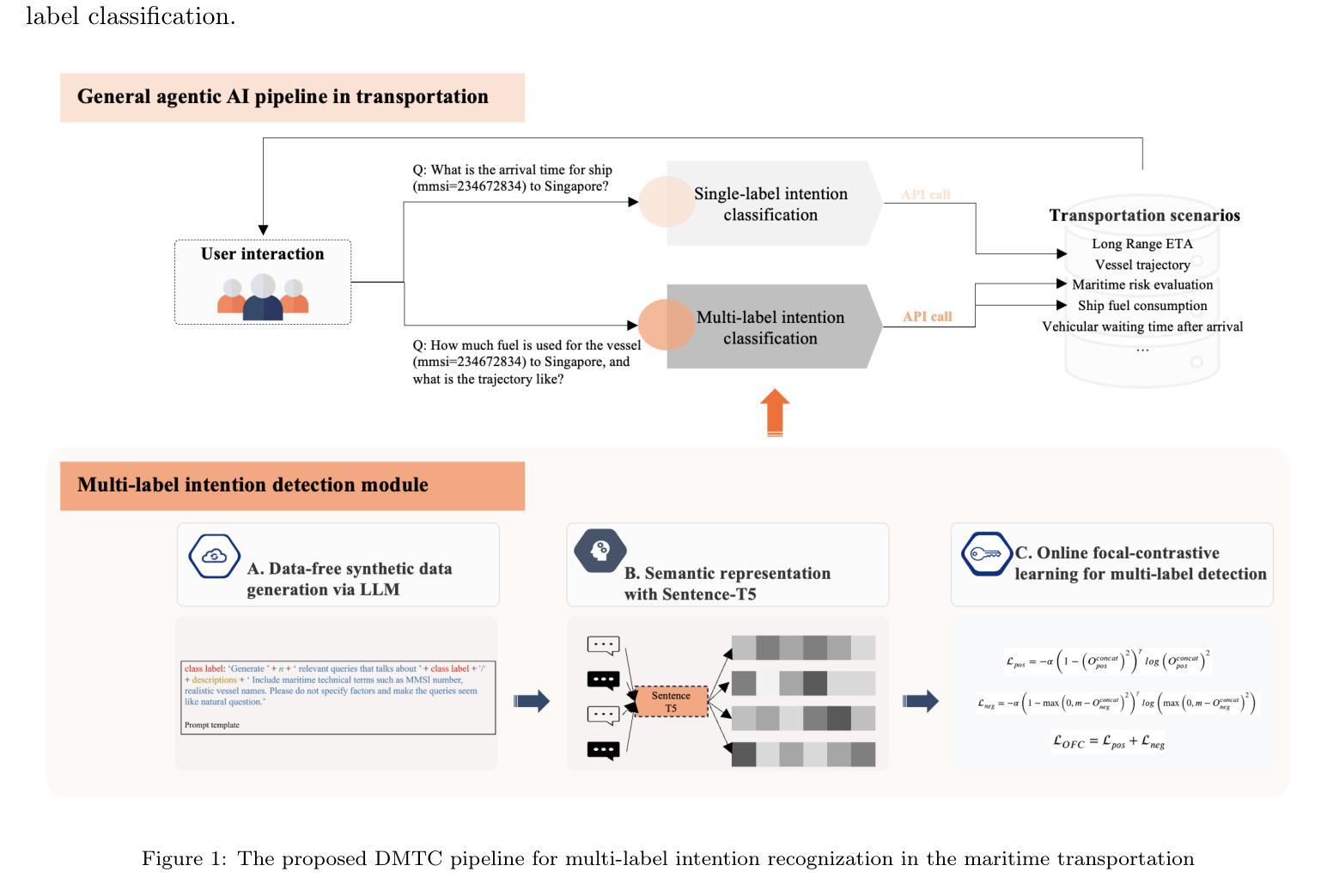 在这项研究中,为交通领域的智能体AI应用提出了一种模块化、无需数据的多标签意图识别流水线。与传统的依赖于大规模注释语料库的意图识别系统不同,我们的方法消除了对昂贵的数据采集的需求,同时提高了多标签意图理解的准确性。具体来说,整个流水线名为DMTC,分为三个步骤:1)使用提示工程引导大型语言模型(LLM)在不同运输场景中生成多样化的合成查询;2)使用Sentence-T5模型对每条文本查询进行编码,以获得紧凑的语义嵌入;3)使用一种新型在线焦点对比(OFC)损失训练轻量级分类器,该损失侧重于困难样本并最大化类间可分性。所提出流水线的适用性在航海交通领域的智能体AI应用中得到了证明。大量实验表明,DMTC的Hamming损失为5.35%,AUC为95.92%,优于最先进的多标签分类器和最新的端到端SOTA LLM基准测试。进一步的分析表明,Sentence-T5嵌入的准确率至少比替代编码器高3.29%,与标准对比目标相比,集成OFC损失产生了额外的0.98%的增益。总之,我们的系统无缝地将用户查询路由到任务特定模块(例如ETA信息、交通风险评估和交通领域中的其他典型场景),为无需昂贵手动标记的完全自主、意图感知的智能体奠定了基础。