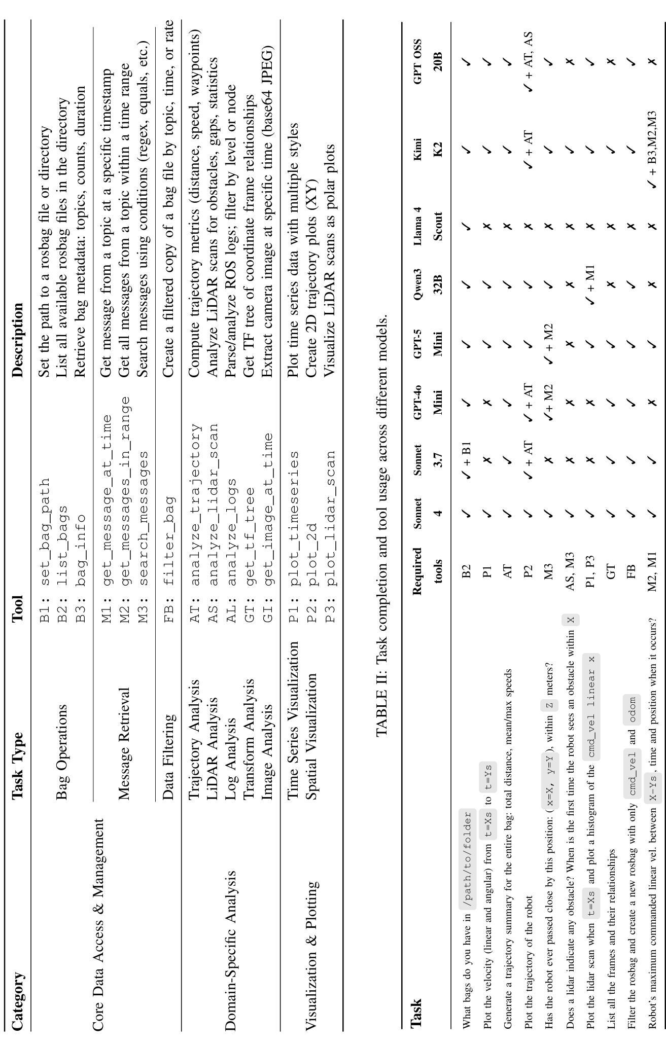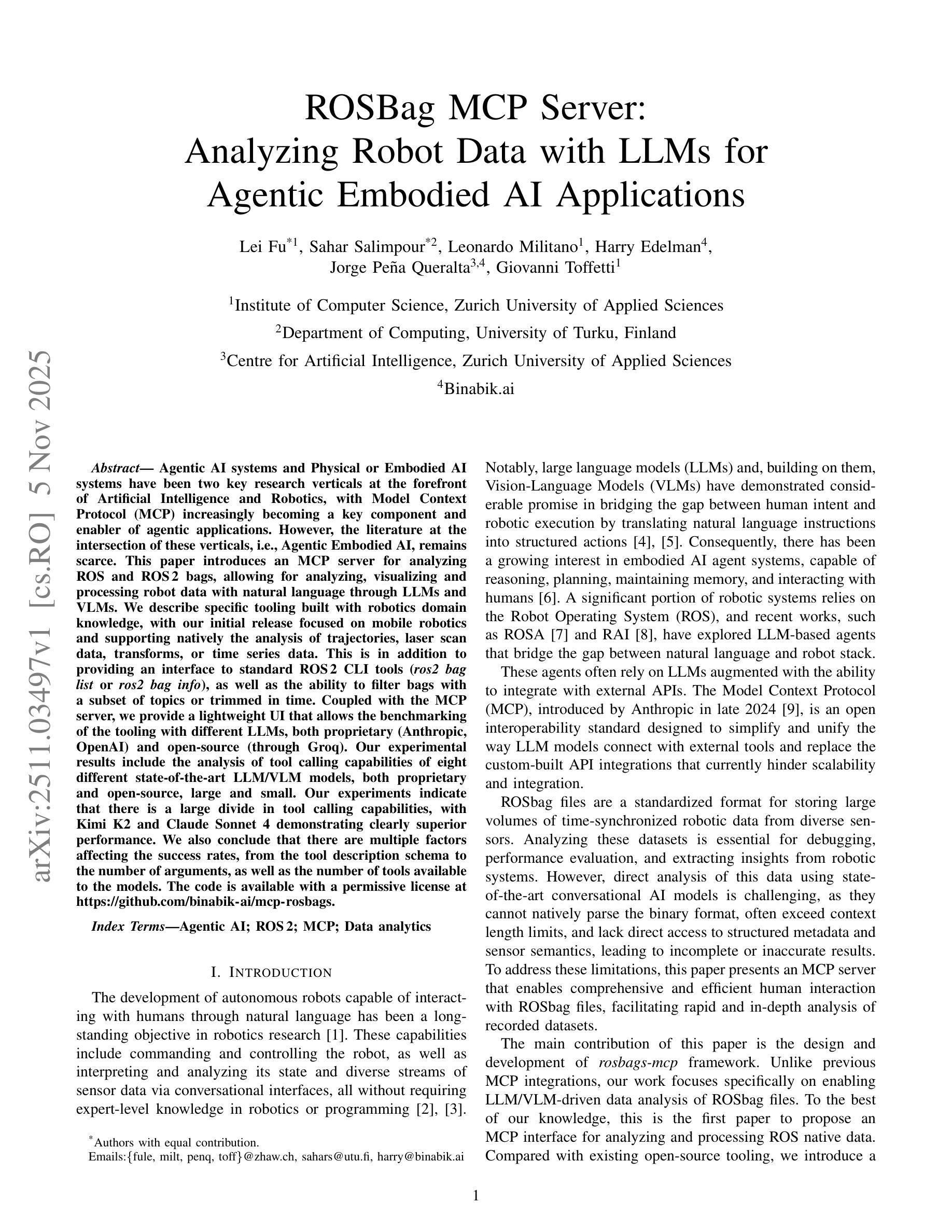 代理人工智能系统(Agentic AI systems)和实体人工智能系统(Physical or Embodied AI systems)是人工智能和机器人技术的前沿两大研究领域,其中模型上下文协议(Model Context Protocol,简称MCP)正逐渐成为代理应用程序的关键组成部分和使能器。然而,关于这两者的交叉领域,即实体代理人工智能(Agentic Embodied AI)的文献仍然很少。本文介绍了一个用于分析ROS和ROS 2数据包的MCP服务器,它可以通过大型语言模型(LLMs)和视觉语言模型(VLMs)使用自然语言来分析、可视化和处理机器人数据。我们描述了利用机器人领域知识构建的特定工具,我们的初步发布重点关注移动机器人,原生支持轨迹分析、激光扫描数据、转换或时间序列数据的分析。此外,我们还提供了与标准ROS 2命令行工具(“ros2 bag list”或“ros2 bag info”)的接口,以及按主题子集或时间修剪过滤数据包的能力。与MCP服务器相结合,我们提供了一个轻量级的用户界面,允许使用不同的LLMs对工具进行基准测试,包括专有(Anthropic、OpenAI)和开源(通过Groq)。我们的实验结果包括对八种不同先进的LLM/VLM模型的工具调用能力分析,既包括专有也包括开源,大型和小型模型都有。我们的实验表明,在工具调用能力上存在很大差距,其中Kimi K2和Claude Sonnet 4表现出明显优越的性能。我们还得出结论,影响成功率的因素有很多,从工具描述模式到参数数量以及模型可用的工具数量。相关代码以许可许可证的形式可在https://github.com/binabik-ai/mcp-rosbags中找到。