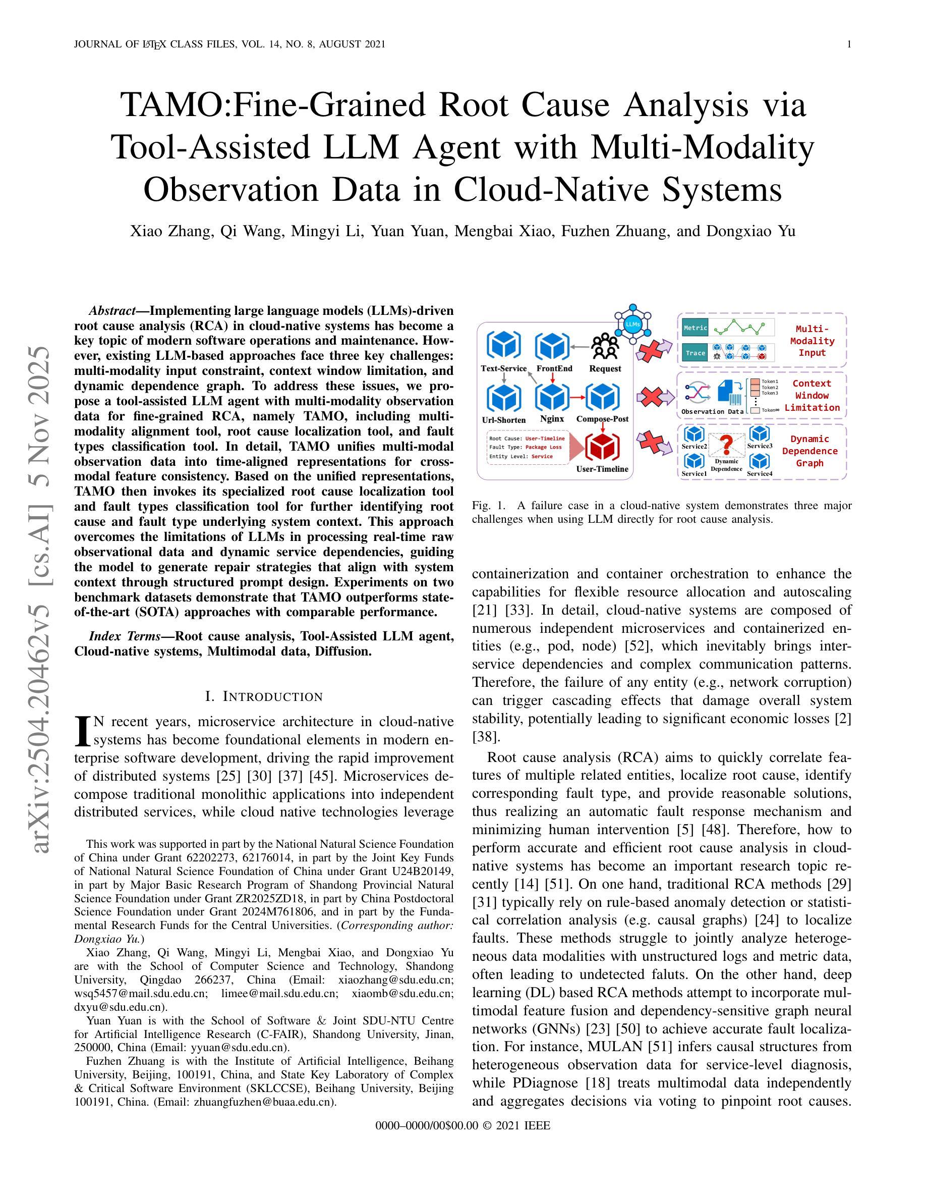 实现大型语言模型(LLM)驱动的根因分析(RCA)在云原生系统中是当代软件操作和维护的关键话题。然而,现有LLM方法面临多模态输入约束、上下文窗口限制和动态依赖图三大挑战。为解决这些问题,我们提出了一个名为TAMO的工具辅助LLM代理,具有多模态观察数据,用于精细RCA。TAMO包括多模态对齐工具、根本原因定位工具和故障类型分类工具。它通过统一多模态观察数据,生成与上下文一致的跨模态特征表示,然后进一步识别根本原因和故障类型。这种方法克服了LLM处理实时原始观测数据和动态服务依赖性的局限性,并通过结构化提示设计引导模型生成与系统上下文一致的修复策略。实验表明,TAMO在基准数据集上的表现优于现有方法。