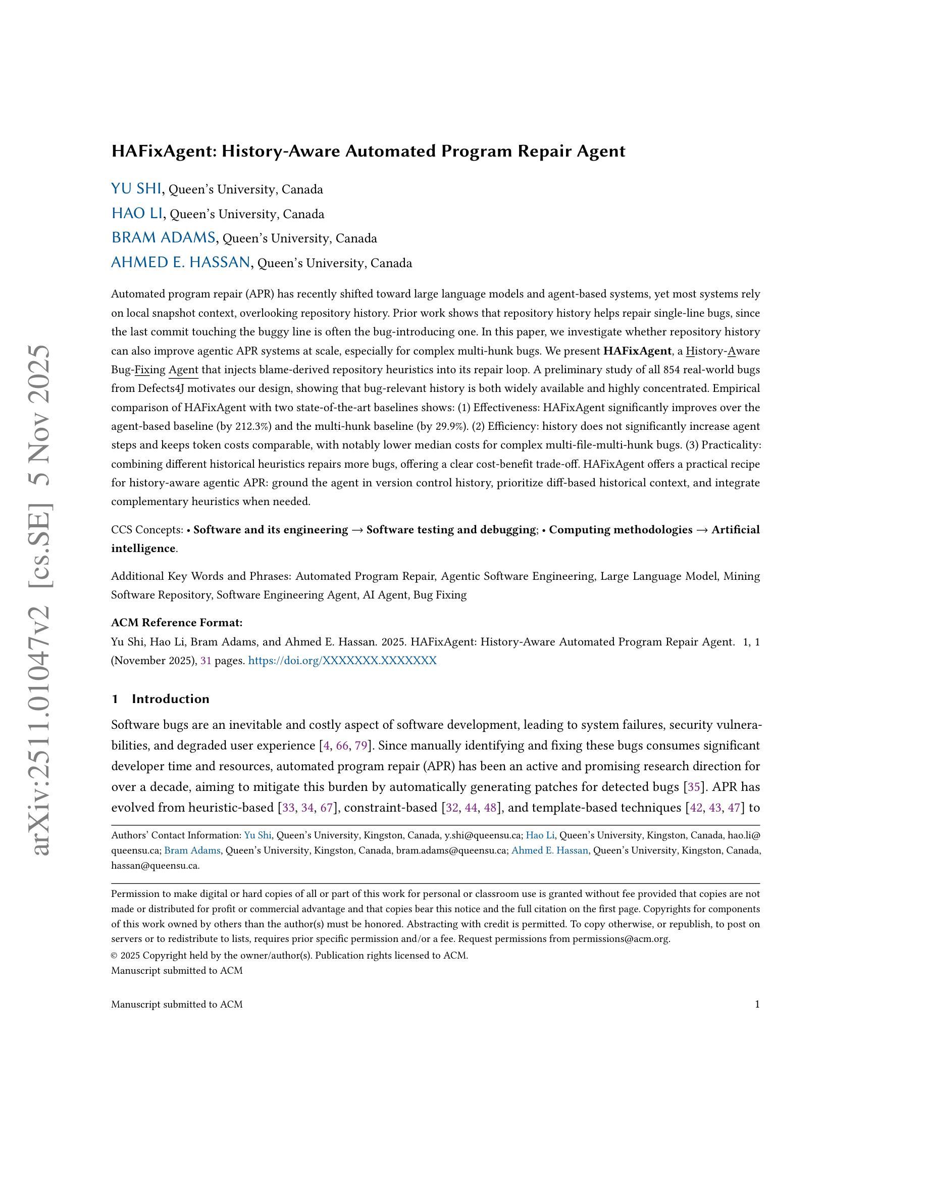 - HAFixAgent是一个历史感知的Bug修复代理,结合了仓库历史启发式信息进入其修复循环中。