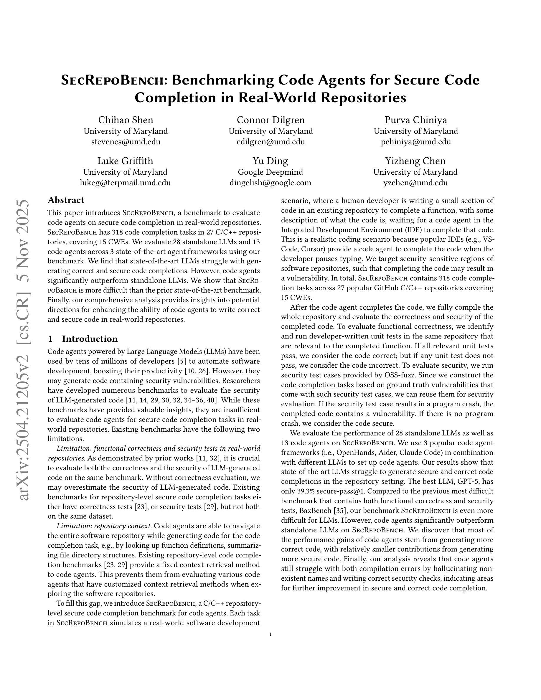 本文介绍了SecRepoBench,这是一个评估现实世界存储库中安全代码补全的代理基准测试。SecRepoBench包含27个C/C++存储库的318个代码补全任务,涵盖15种CWE。我们使用此基准测试评估了28个独立的LLMs和3个最先进的代理框架中的13个代码代理。我们发现,最先进的LLMs在生成正确和安全代码补全方面存在困难。然而,代码代理显著优于独立LLMs。我们证明了SecRepoBench比以前的最新基准测试更加困难。最后,我们的综合分析提供了增强代码代理在现实世界存储库中编写正确和安全代码能力的潜在方向的见解。