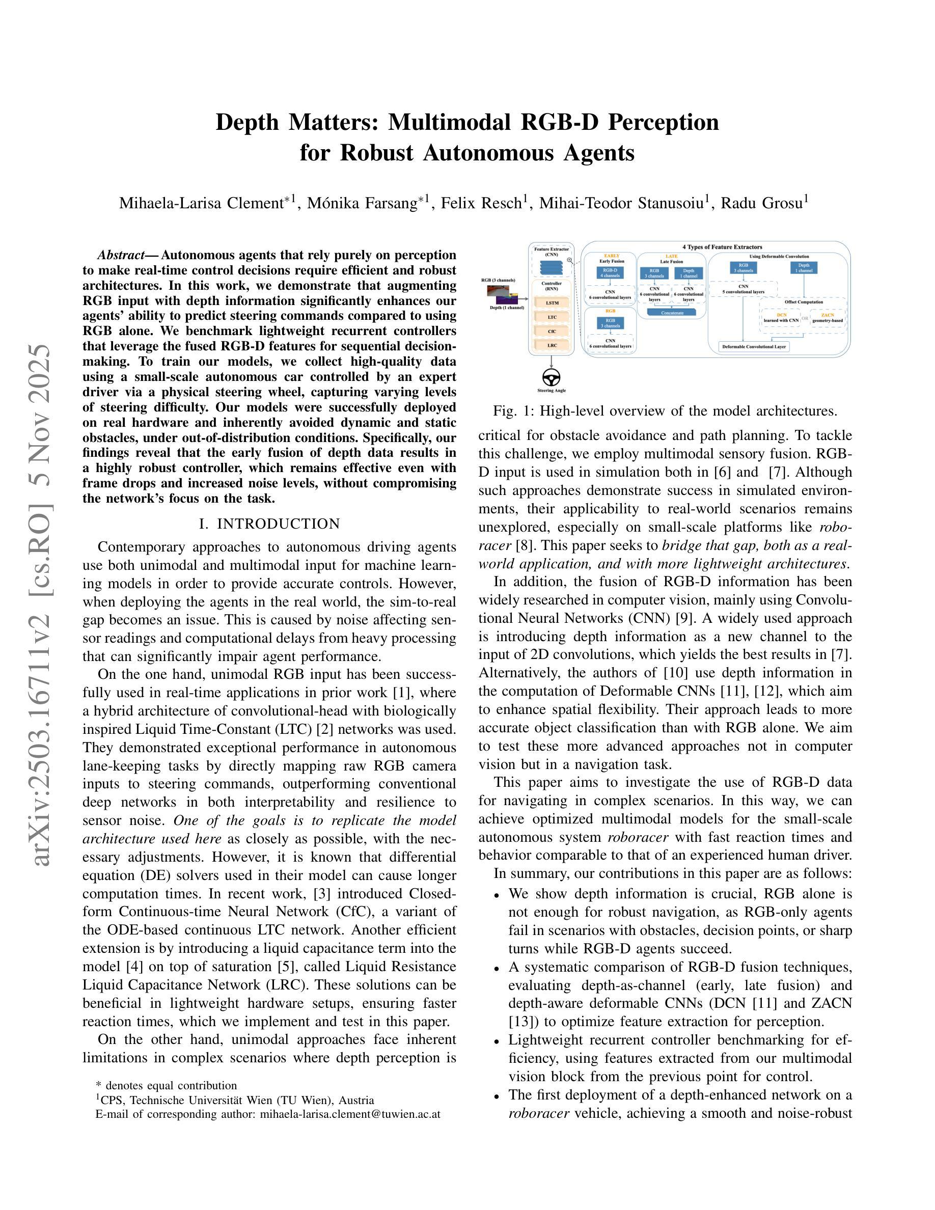 基于感知的自主代理需要高效稳定的架构来做出实时控制决策。本研究通过融合RGB和深度信息,显著提高了代理预测转向命令的能力。我们利用融合后的RGB-D特征进行序列决策,并采用了轻量级的递归控制器。通过专家驾驶的小型自主汽车收集高质量数据来训练模型,模型能够应对不同难度的转向挑战。模型成功部署在实际硬件上,能在不同条件下的场景中避免动态和静态障碍。特别是,研究发现早期融合深度数据会生成稳健的控制器,即使在帧率降低和噪声增加的情况下仍然有效。这不会影响网络专注于任务的本质特性。