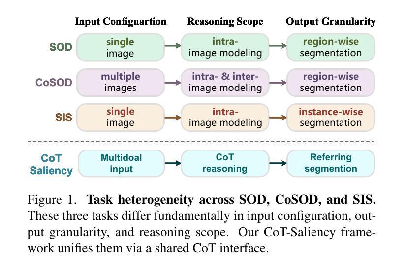 我们提出了第一个统一框架,通过采用思维链(CoT)推理过程,将操作异质的显著性任务(例如SOD、CoSOD和SIS)联合处理,以弥合任务之间的异质性鸿沟。思维链训练遵循两阶段模式:监督微调(SFT)和强化学习(RL)。为了提高强化学习中的思维链质量,我们提出了信心引导策略优化(CGPO),这是一种轻量级的单样本算法,利用奖励与模型信心之间的差异作为每个样本的优势信号。这种设计自然地专注于更新信息响应,同时消除了群体采样,从而解决了关键限制:信心无关的学习、信号稀释和计算开销过高的问题。我们还引入了“输出到推理”的策略来构建高保真SFT数据,确保与地面真实掩码的内在逻辑一致性。实验表明,我们的模型在所有任务上达到了或超越了专门的最新方法以及强大的封闭式视觉语言模型的表现。特别是在CoCA上的CoSOD任务上,我们实现了S-measure为0.899的得分,在之前最好的成绩基础上提高了8个百分点,尽管使用了较少的训练数据。