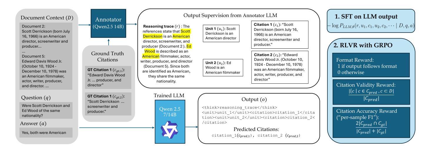 大型语言模型(LLM)越来越多地用于长文档问答,其中可靠的来源归属对于信任至关重要。现有的事后归因方法在提取式问答中效果很好,但在多跳、抽象和半抽象设置中面临困难,这些设置中的答案会综合跨段落的信息。为了应对这些挑战,我们认为事后归因可以重新构建为推理问题,其中答案被分解为构成单元,每个单元都与特定上下文相关联。我们首先证明,提示模型生成这种分解同时归因可以提高性能。在此基础上,我们引入了DecompTune,这是一种事后训练方法,可以教导模型将答案分解作为中间推理步骤来产生。我们整理了一个复杂的问答任务数据集,由强大的LLM进行分解注释,并使用任务特定奖励的两阶段SFT+GRPO管道对Qwen-2.5(7B和14B)进行事后训练。通过广泛的实验和消融研究,DecompTune大幅提高了归因质量,优于以前的方法,并匹配或超过最前沿的模型。