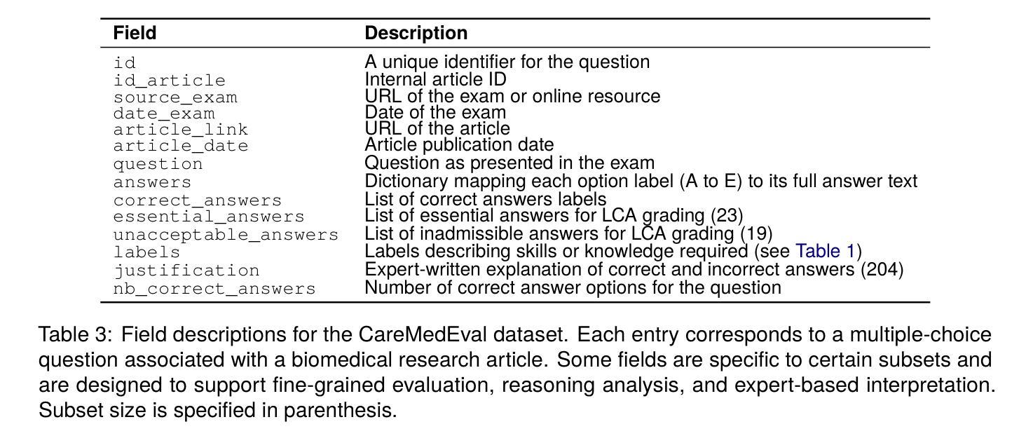 - CareMedEval是一个专门设计用于评估大型语言模型在生物医学批评评价和推理任务性能的数据集。