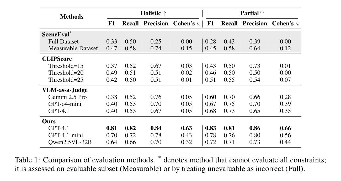 - 现有评估方法如CLIPScore和VLM无法准确评估场景与指令的对齐情况。