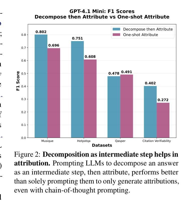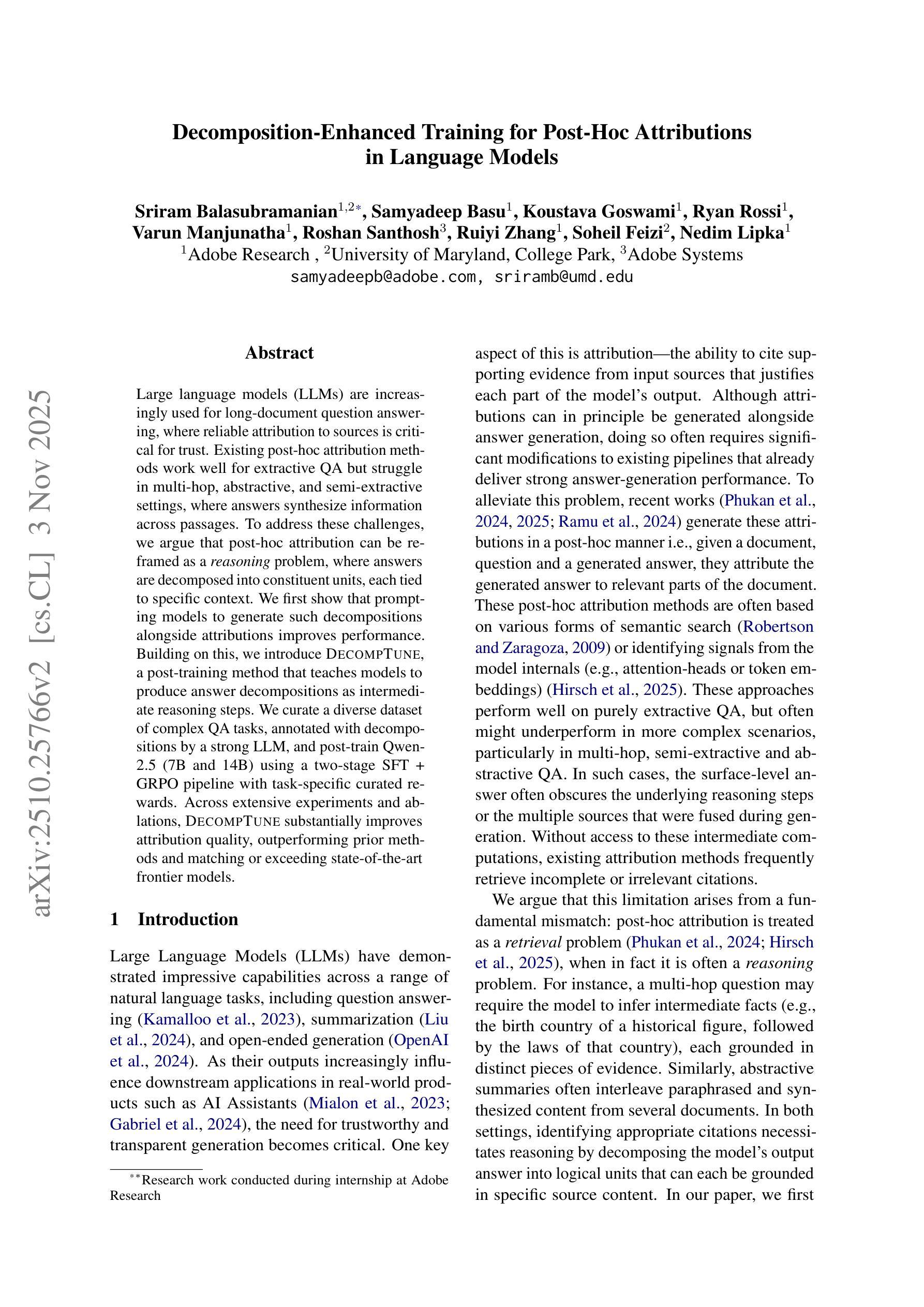 大型语言模型(LLM)在长篇文档问答中的应用日益广泛,可靠的来源归属对信任至关重要。现有的事后归属方法在提取式问答中表现良好,但在多跳、抽象和半提取式设置中面临挑战,这些设置中的答案会综合各段落的信息。为应对这些挑战,我们提出将事后归属重新定位为推理问题,答案被分解为与特定上下文相关联的组成部分。我们首先展示通过提示模型生成此类分解并伴随归属可以提高性能。在此基础上,我们引入了DecompTune,这是一种事后训练方法,可教导模型将答案分解作为中间推理步骤。我们使用强大的LLM对复杂的问答任务进行了多样化的数据集标注,并通过两阶段SFT+GRPO管道使用特定任务奖励对Qwen-2.5(7B和14B)进行事后训练。经过广泛的实验和减损测试,DecompTune大幅提高了归属质量,优于先前的方法,并达到或超越了前沿模型的水平。