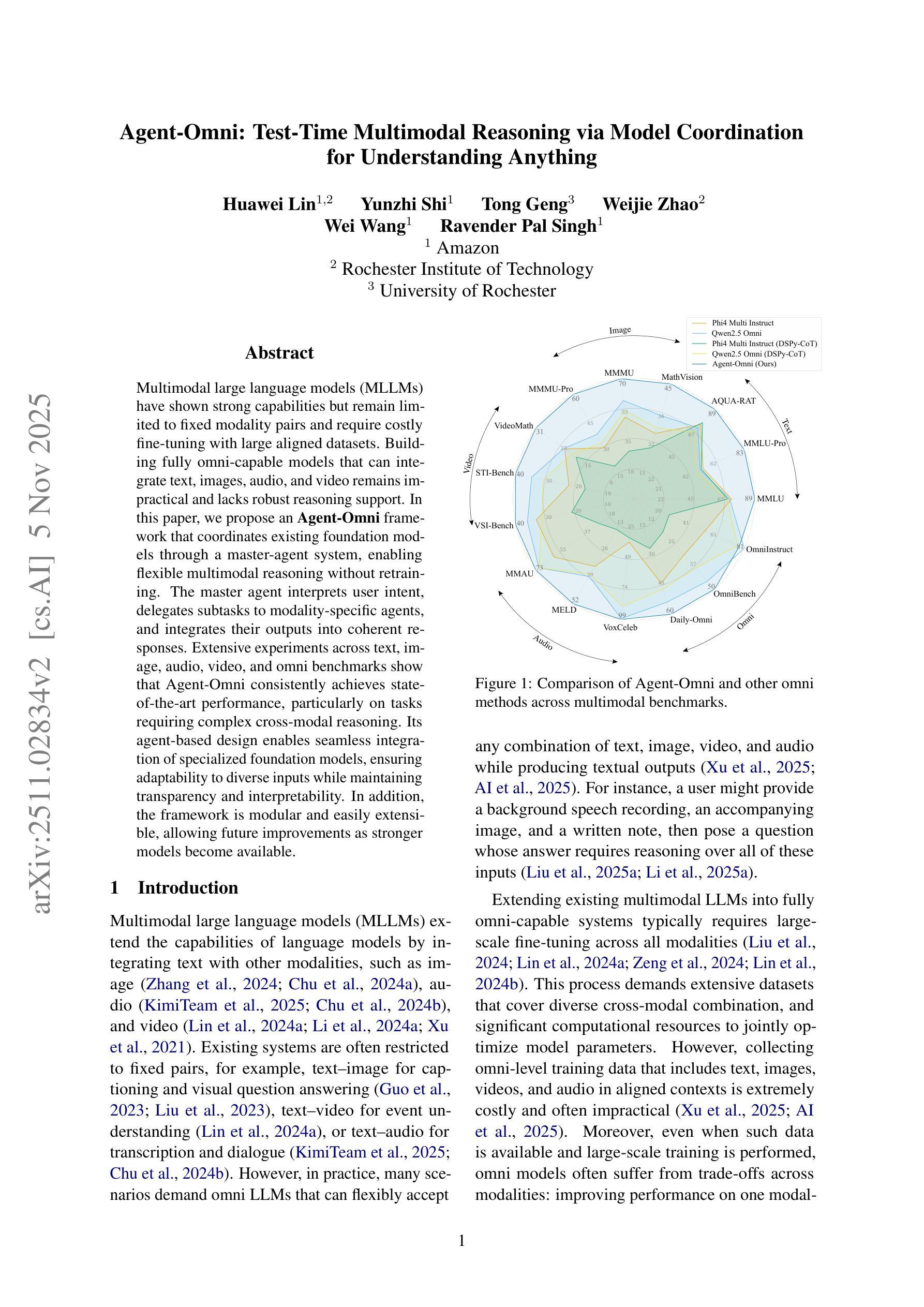 - Agent-Omni框架通过主代理系统协调现有基础模型,实现灵活多模态推理。