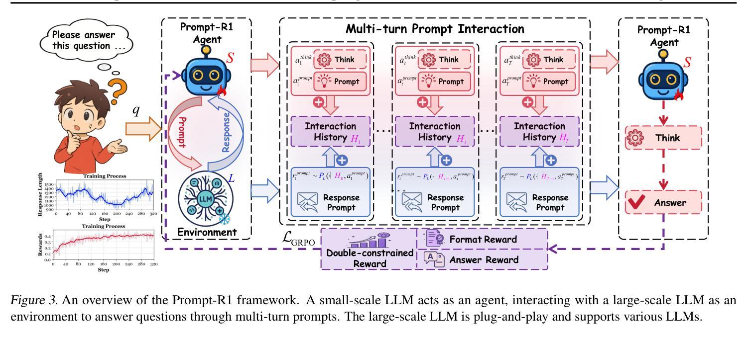 - Prompt-R1采用小型LLM与大型LLM协作,进行多轮提示交互。