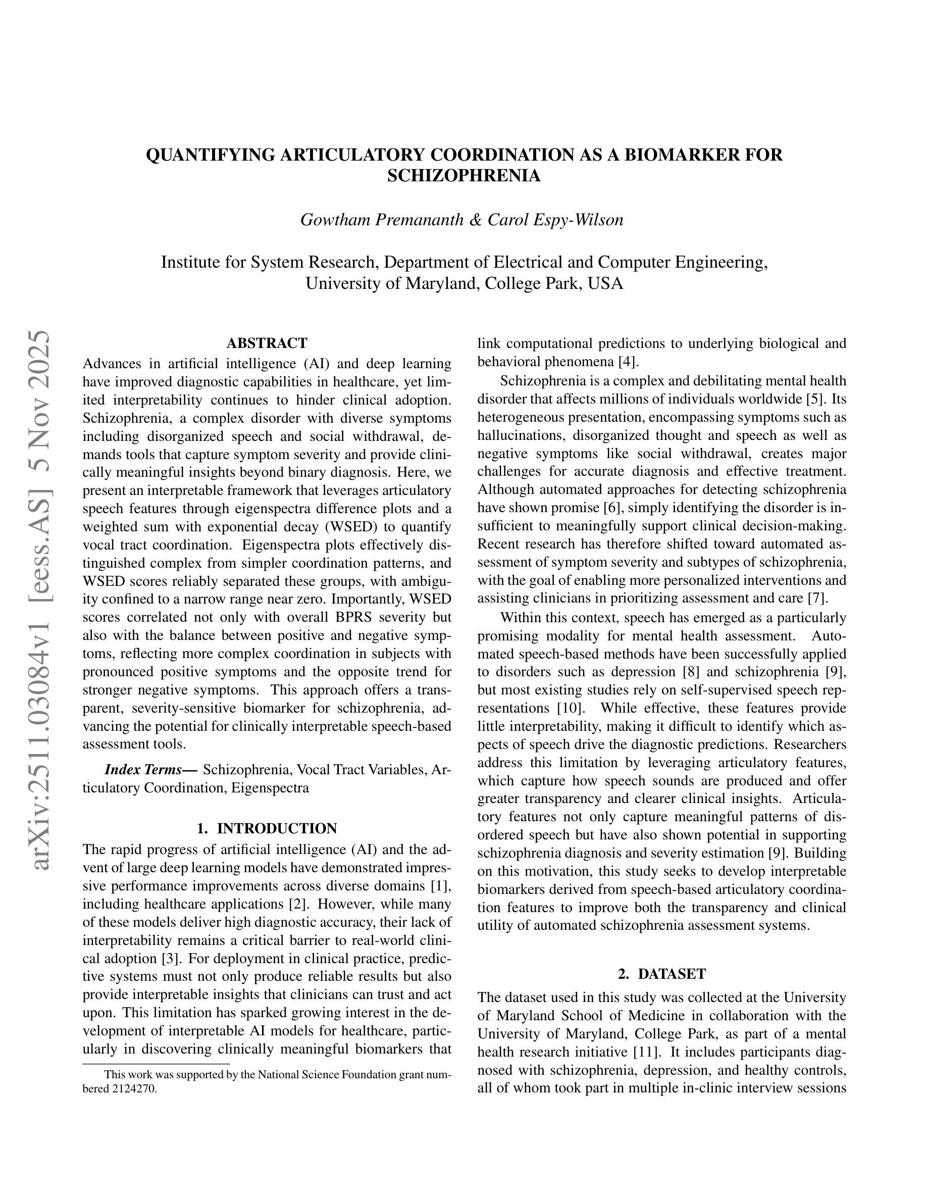 Advances in artificial intelligence (AI) and deep learning have improved diagnostic capabilities in healthcare, yet limited interpretability continues to hinder clinical adoption. Schizophrenia, a complex disorder with diverse symptoms including disorganized speech and social withdrawal, demands tools that capture symptom severity and provide clinically meaningful insights beyond binary diagnosis. Here, we present an interpretable framework that leverages articulatory speech features through eigenspectra difference plots and a weighted sum with exponential decay (WSED) to quantify vocal tract coordination. Eigenspectra plots effectively distinguished complex from simpler coordination patterns, and WSED scores reliably separated these groups, with ambiguity confined to a narrow range near zero. Importantly, WSED scores correlated not only with overall BPRS severity but also with the balance between positive and negative symptoms, reflecting more complex coordination in subjects with pronounced positive symptoms and the opposite trend for stronger negative symptoms. This approach offers a transparent, severity-sensitive biomarker for schizophrenia, advancing the potential for clinically interpretable speech-based assessment tools.
