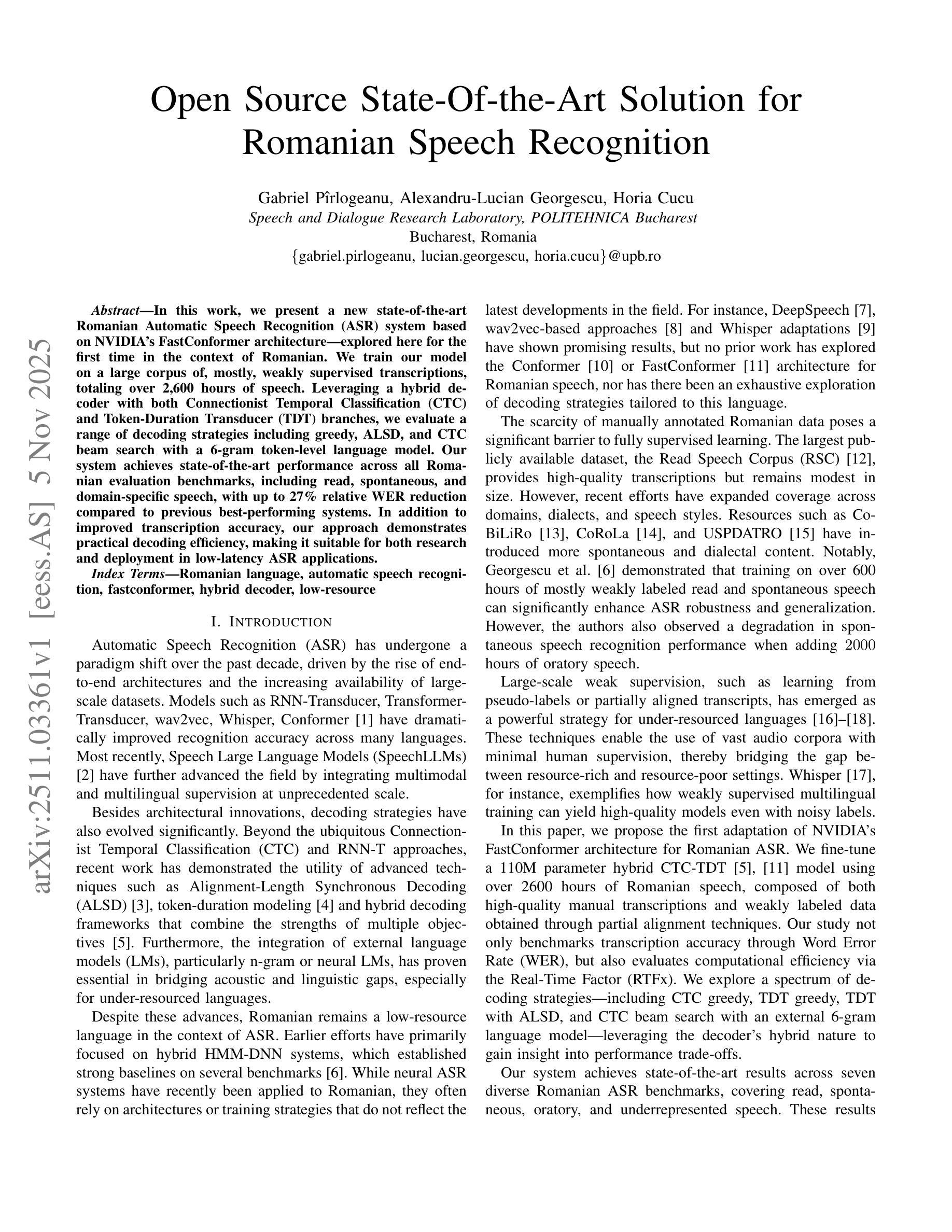 在这项工作中,我们基于NVIDIA的FastConformer架构,提出了一种最新的罗马尼亚语自动语音识别(ASR)系统——这是该架构首次在罗马尼亚语境下进行研究。我们在大量的、主要是弱监督转录语料库上训练模型,总语音时长超过2600小时。我们利用混合解码器,结合了连接时序分类(CTC)和令牌持续时间转换器(TDT)分支,评估了一系列解码策略,包括贪心、ALSD和带有6元令牌级语言模型的CTC集束搜索。我们的系统在罗马尼亚所有的评估基准测试中均达到了最新性能,包括阅读、即兴和特定领域的语音,与之前的最佳系统相比,相对字词错误率(WER)降低了高达27%。除了提高转录准确性外,我们的方法还展示了实用的解码效率,使其适用于低延迟ASR应用的研究和部署。