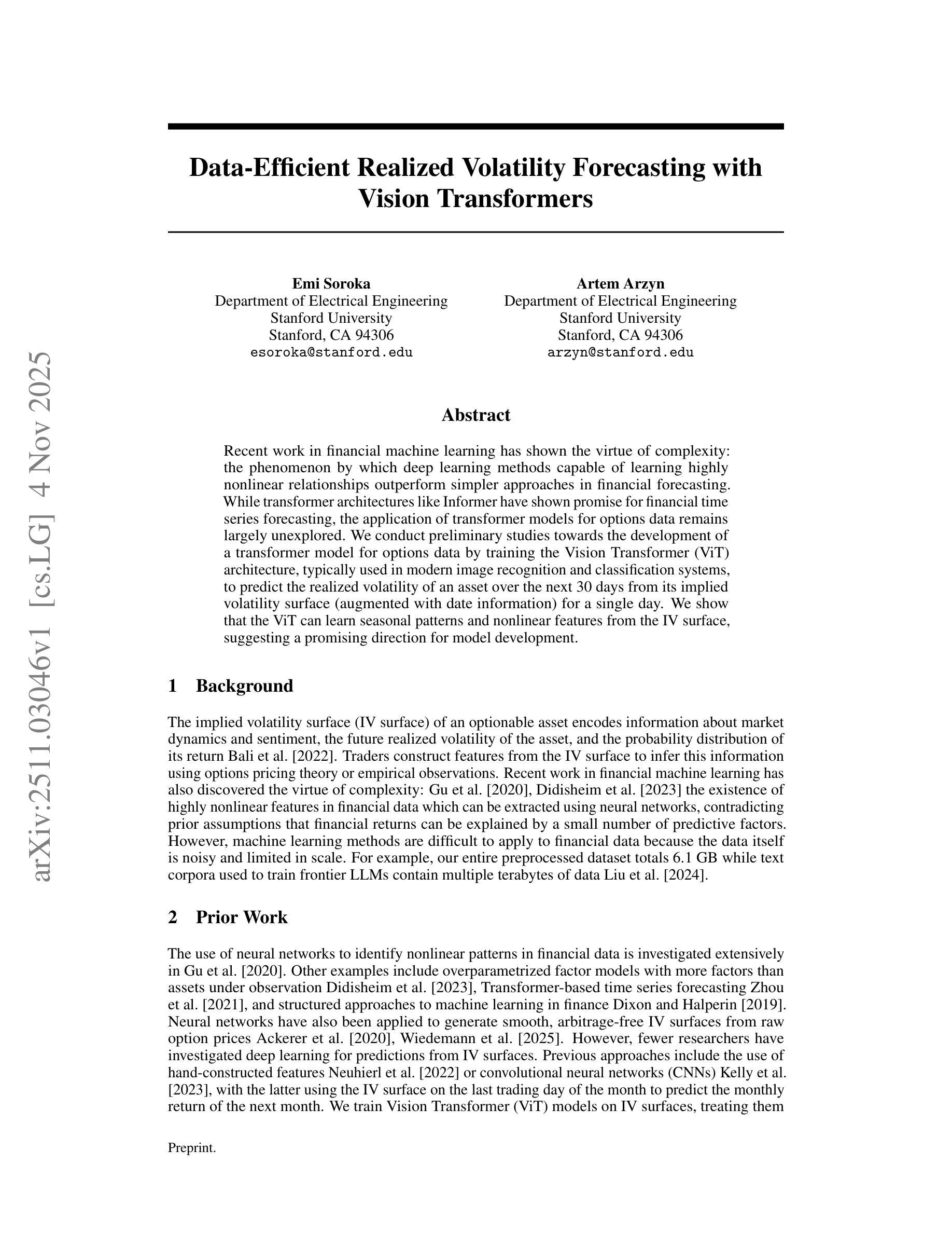 近期金融机器学习研究证明了复杂性优势:深度学习方法能够学习高度非线性关系,在金融预测方面表现出优于简单方法的效果。尽管如Informer等transformer架构在金融时间序列预测方面显示出潜力,但将transformer模型应用于期权数据的研究仍相对较少。本研究通过训练通常用于现代图像识别和分类系统的Vision Transformer (ViT)架构,以预测单一日的隐含波动率数据所对应的资产未来30天的实际波动率,进行了初步研究。研究表明ViT能从隐含波动率数据中学习季节性模式和非线性特征,为模型开发提供了有前景的方向。
