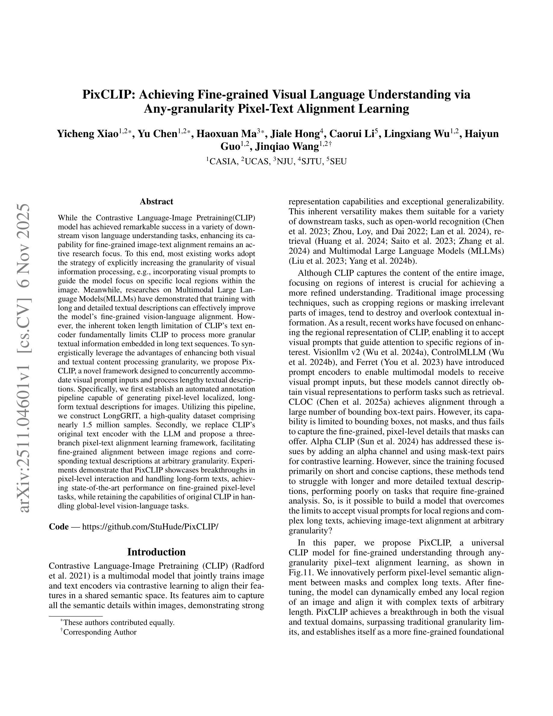 While the Contrastive Language-Image Pretraining(CLIP) model has achieved remarkable success in a variety of downstream vison language understanding tasks, enhancing its capability for fine-grained image-text alignment remains an active research focus. To this end, most existing works adopt the strategy of explicitly increasing the granularity of visual information processing, e.g., incorporating visual prompts to guide the model focus on specific local regions within the image. Meanwhile, researches on Multimodal Large Language Models(MLLMs) have demonstrated that training with long and detailed textual descriptions can effectively improve the model’s fine-grained vision-language alignment. However, the inherent token length limitation of CLIP’s text encoder fundamentally limits CLIP to process more granular textual information embedded in long text sequences. To synergistically leverage the advantages of enhancing both visual and textual content processing granularity, we propose PixCLIP, a novel framework designed to concurrently accommodate visual prompt inputs and process lengthy textual descriptions. Specifically, we first establish an automated annotation pipeline capable of generating pixel-level localized, long-form textual descriptions for images. Utilizing this pipeline, we construct LongGRIT, a high-quality dataset comprising nearly 1.5 million samples. Secondly, we replace CLIP’s original text encoder with the LLM and propose a three-branch pixel-text alignment learning framework, facilitating fine-grained alignment between image regions and corresponding textual descriptions at arbitrary granularity. Experiments demonstrate that PixCLIP showcases breakthroughs in pixel-level interaction and handling long-form texts, achieving state-of-the-art performance.