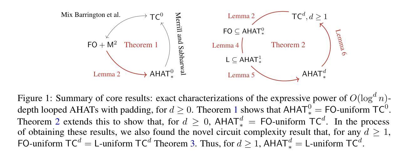 - 通过使用填充和循环技术,证明了填充变压器能够精确识别可并行化问题类$\text{FO}$-uniform $\text{TC}^d$。