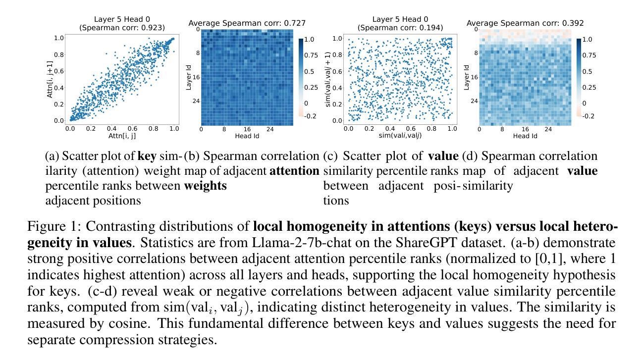 - KV缓存中存在键和值分布不对称的问题,即键的分布呈现局部同质性,而值的分布是异构的。