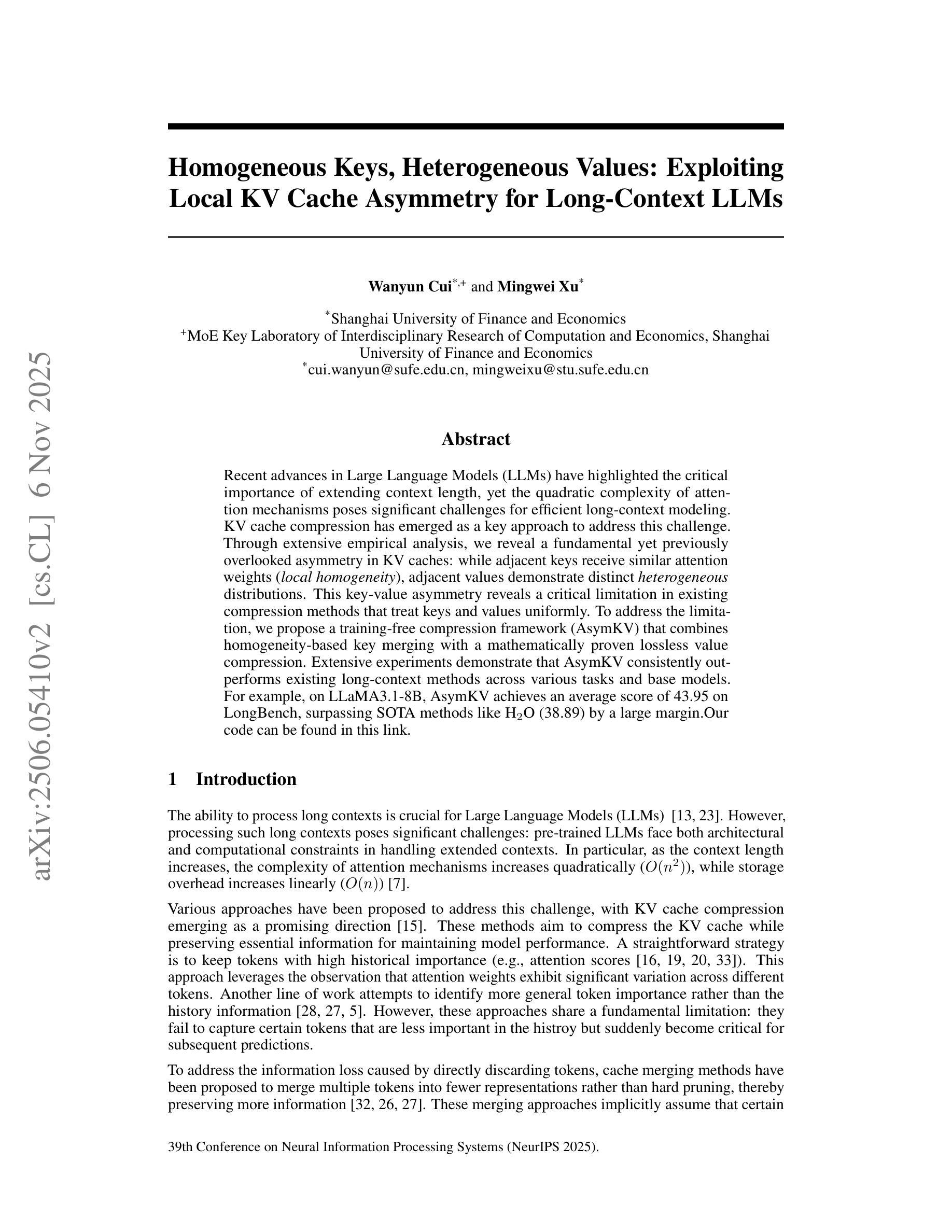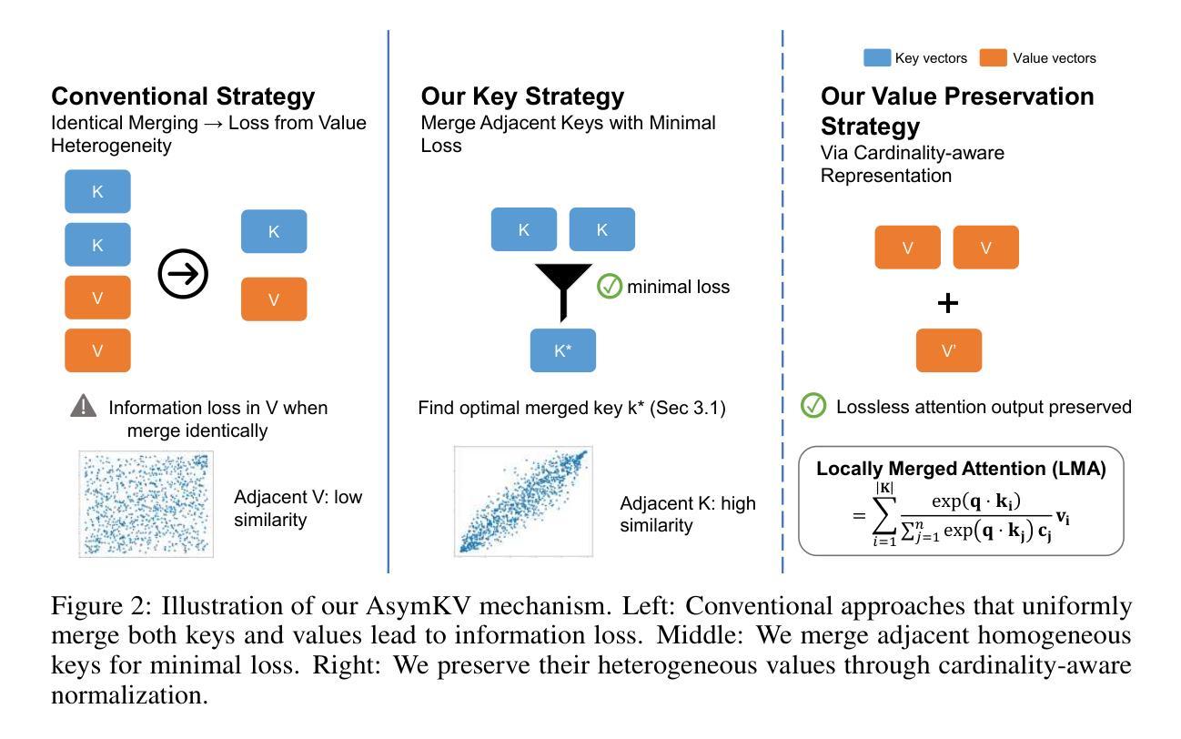 近期大型语言模型(LLM)的进步凸显了扩展上下文长度的重要性,然而,注意力机制的二次复杂性为高效长上下文建模带来了重大挑战。KV缓存压缩已成为应对这一挑战的关键方法。通过广泛的实证分析,我们发现了KV缓存中一个基本且之前被忽视的不对称性:虽然相邻的键会获得相似的注意力权重(局部同质性),但相邻的值却表现出不同的异质性分布。这种键值不对称性揭示了现有压缩方法在统一处理键和值时存在的关键局限性。为了解决这一局限性,我们提出了一种无需训练的压缩框架(AsymKV),该框架结合了基于同质性键合并和经过数学证明的无损值压缩。大量实验表明,在各种任务和基准模型上,AsymKV始终优于现有的长上下文方法。例如,在LLaMA3.1-8B上,AsymKV在LongBench上的平均得分为43.95,大幅度超越了H_2O(38.89)等最新方法。我们的代码可以在这个链接中找到:https://github.com/the-scale-lab/Asymkv。