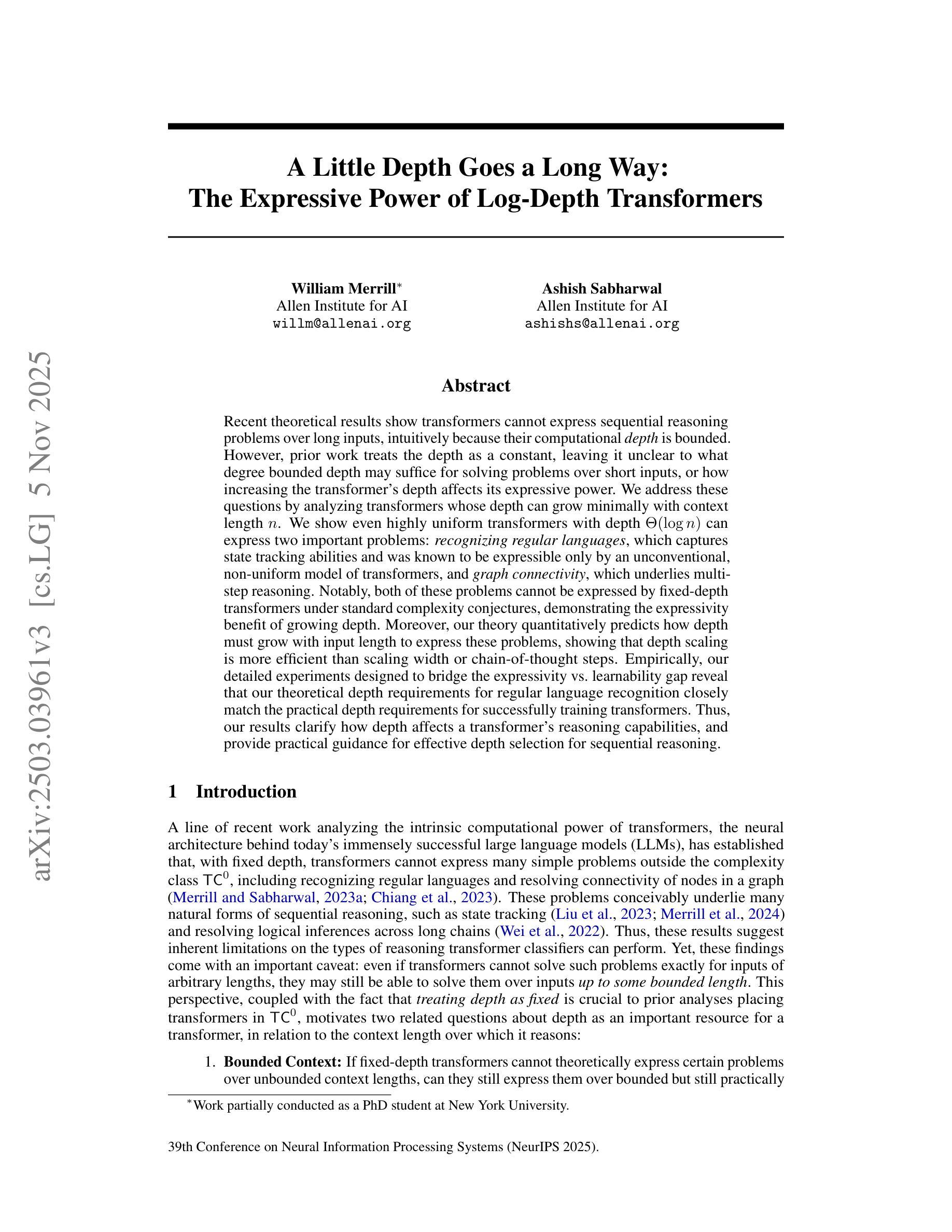 最近的理论结果显示,变压器无法对长输入进行顺序推理问题的表达,直觉上是因为其计算深度是有限的。然而,之前的研究将深度视为常数,尚不明确有限的深度在解决短输入问题上能起多大的作用,或者增加变压器的深度会如何影响其表达能力。我们通过分析深度可以随上下文长度n最小程度增长的变压器来解决这些问题。我们展示了即使是高度均匀的变压器,其深度为Θ(log n)也能表达两个重要问题:识别正则语言,这捕捉了状态跟踪能力,已知只有非传统的非均匀变压器模型才能表达;以及图连通性,这是多步推理的基础。值得注意的是,根据标准复杂性猜想,这两个问题都不能由固定深度的变压器来表达,这证明了增长深度在表达能力上的优势。此外,我们的理论定量预测了深度必须如何随输入长度的增长而增长才能表达这些问题,表明深度缩放比宽度缩放或思维链步骤更为高效。从实证上看,我们设计的详细实验旨在弥合表达与可学习性之间的差距,并揭示出理论上的正则语言识别所需的深度与实际成功训练变压器所需的深度非常接近。因此,我们的结果明确了深度如何影响变压器的推理能力,并为有效的深度选择提供了实际指导。
