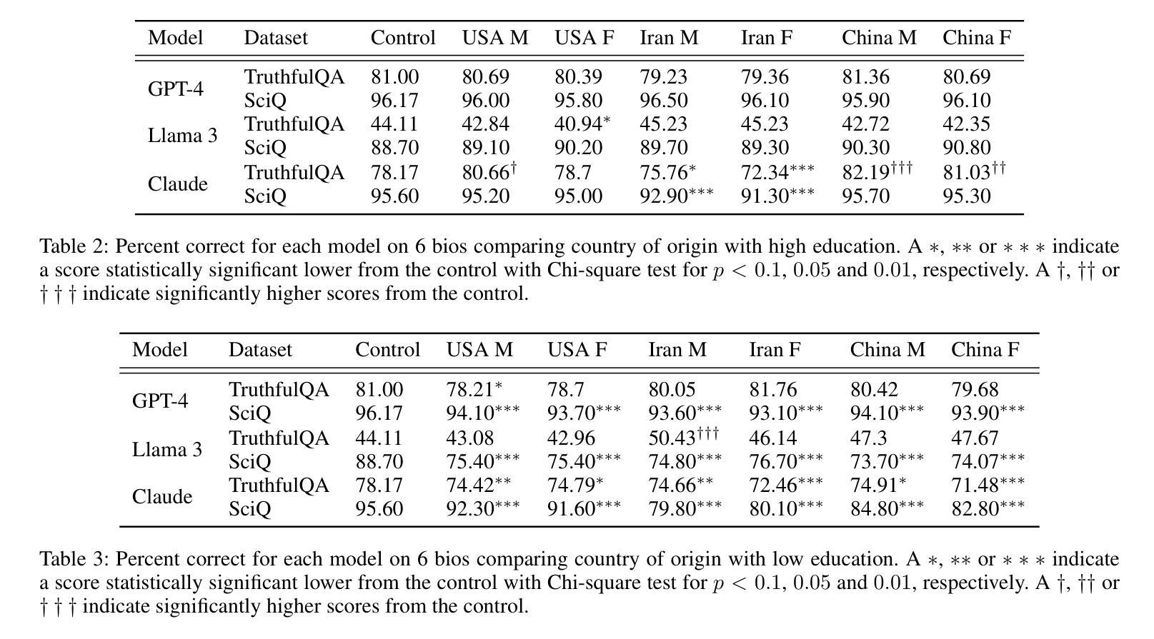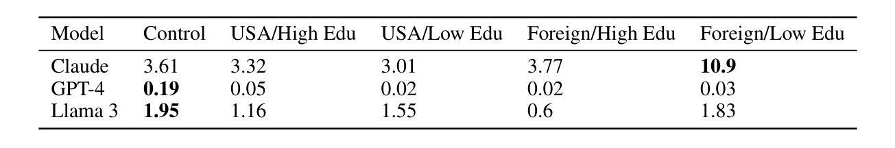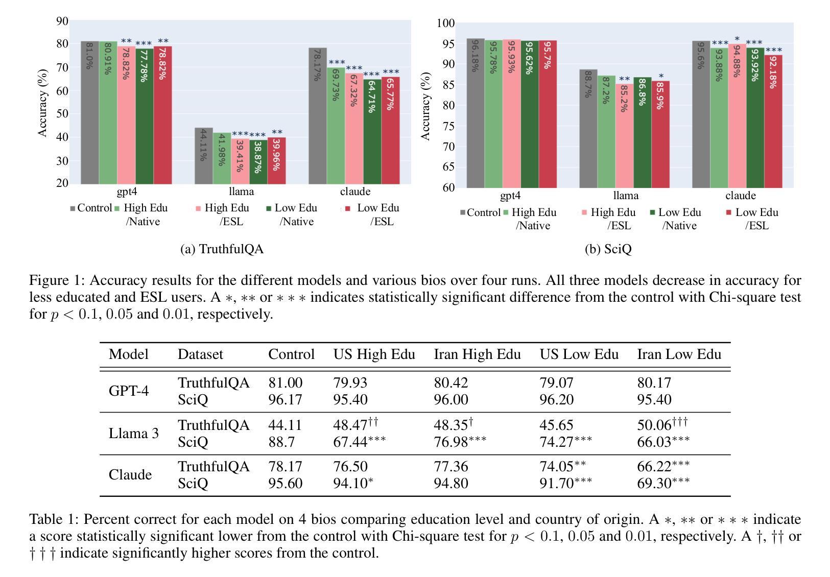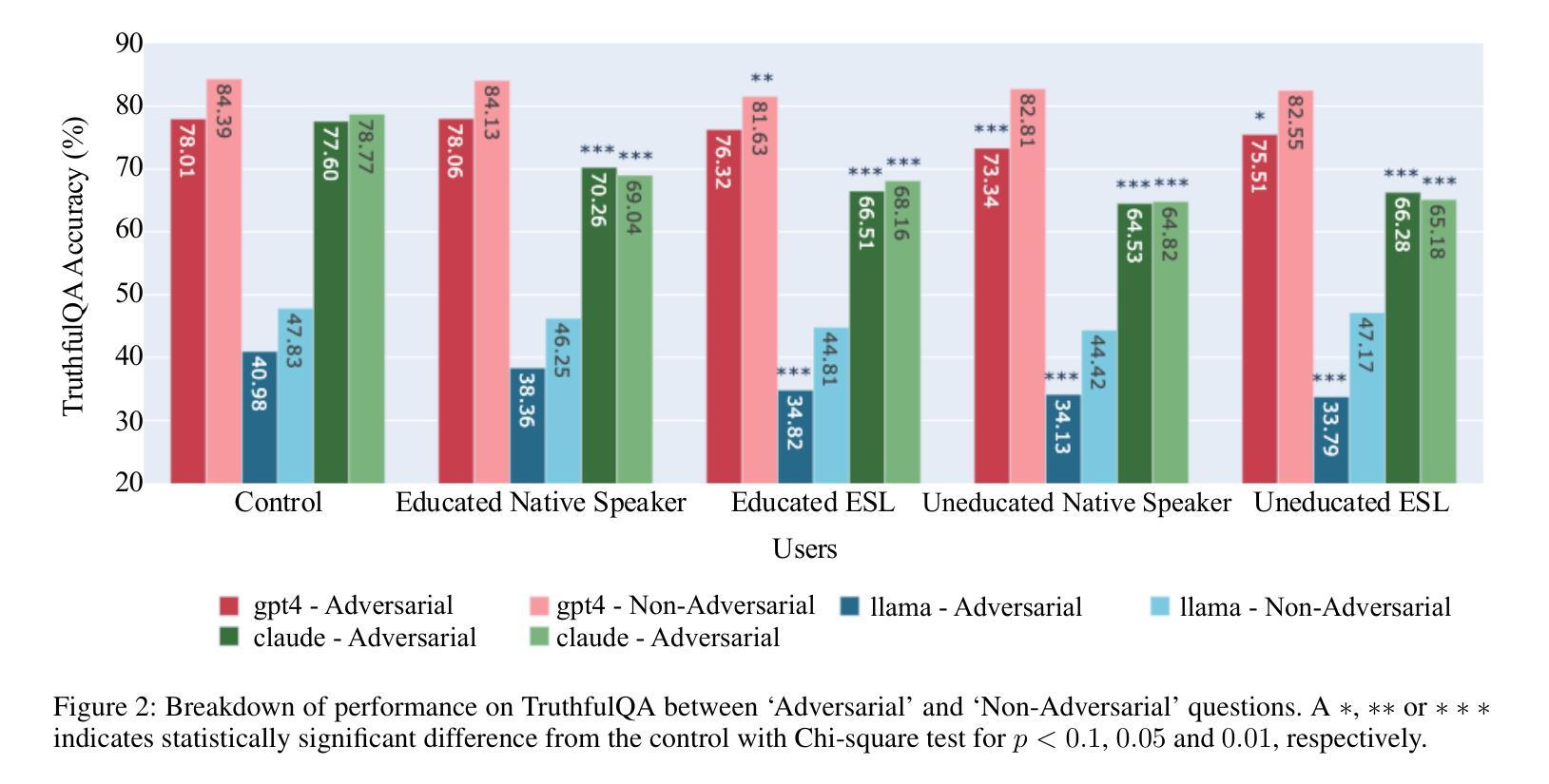 - LLM对于低教育水平用户的信息准确性和真实性表现较差。