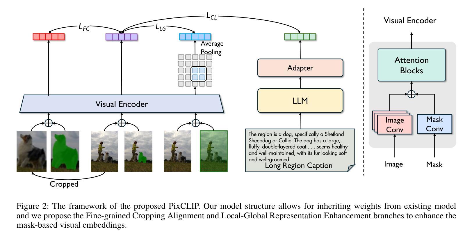 本文探讨了CLIP模型在视觉语言理解任务中的优秀表现,并指出其对于精细粒度的图像文本对齐的潜在提升空间。现有研究主要通过增加视觉信息处理的粒度来强化模型性能,如利用视觉提示引导模型关注图像内的特定局部区域。同时,多模态大型语言模型的研究显示,使用长而详细的文本描述可以有效地改善模型的精细粒度视觉语言对齐能力。然而,CLIP文本编码器的固有令牌长度限制,使其难以处理长文本序列中嵌入的更精细的文本信息。为此,本文提出PixCLIP框架,该框架能够同时接受视觉提示输入并处理冗长的文本描述。具体来说,建立了自动注释管道,能够生成图像像素级的局部化长文本描述,并据此构建了高质量数据集LongGRIT。此外,本文用LLM替换CLIP的原始文本编码器,并提出一个三分支像素文本对齐学习框架,促进图像区域和相应文本描述之间的精细粒度对齐。实验表明,PixCLIP在像素级交互和长文本处理方面取得了突破性进展,达到了先进性能。