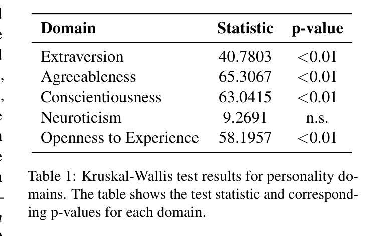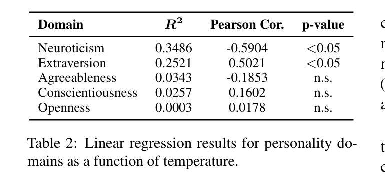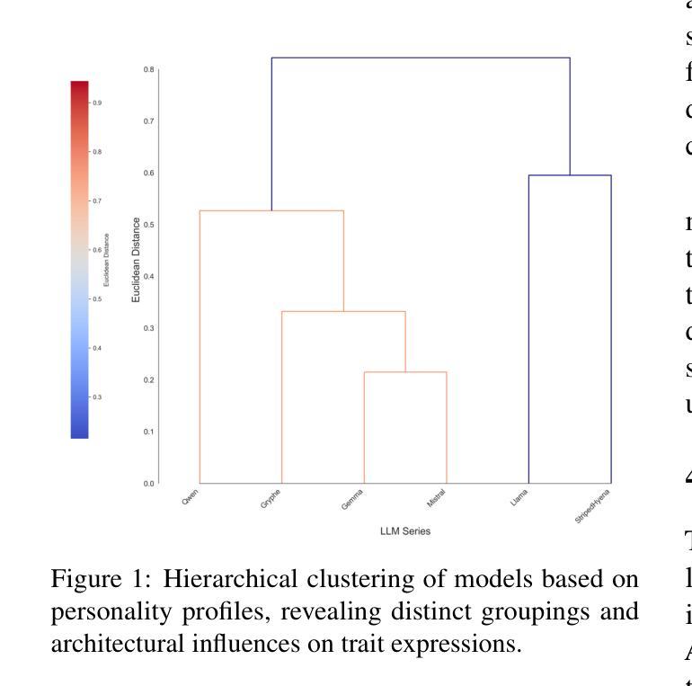 基于大型语言模型(LLM)在以人为中心的应用中的重要作用,理解其人格化行为对于负责任的开发和部署至关重要。本文系统地评估了六种LLM,应用大五人格量表第二版(BFI-2)框架来评估不同采样温度下的特质表达。研究发现四种人格维度存在显著差异,神经质和外向性易受温度调整影响。此外,层次聚类揭示了不同的模型集群,表明架构特性可能会使某些模型趋于稳定的人格特征。研究结果为理解LLM中出现的人格化模式提供了新视角,并为模型调优、选择和人工智能系统的伦理治理提供了新视角。