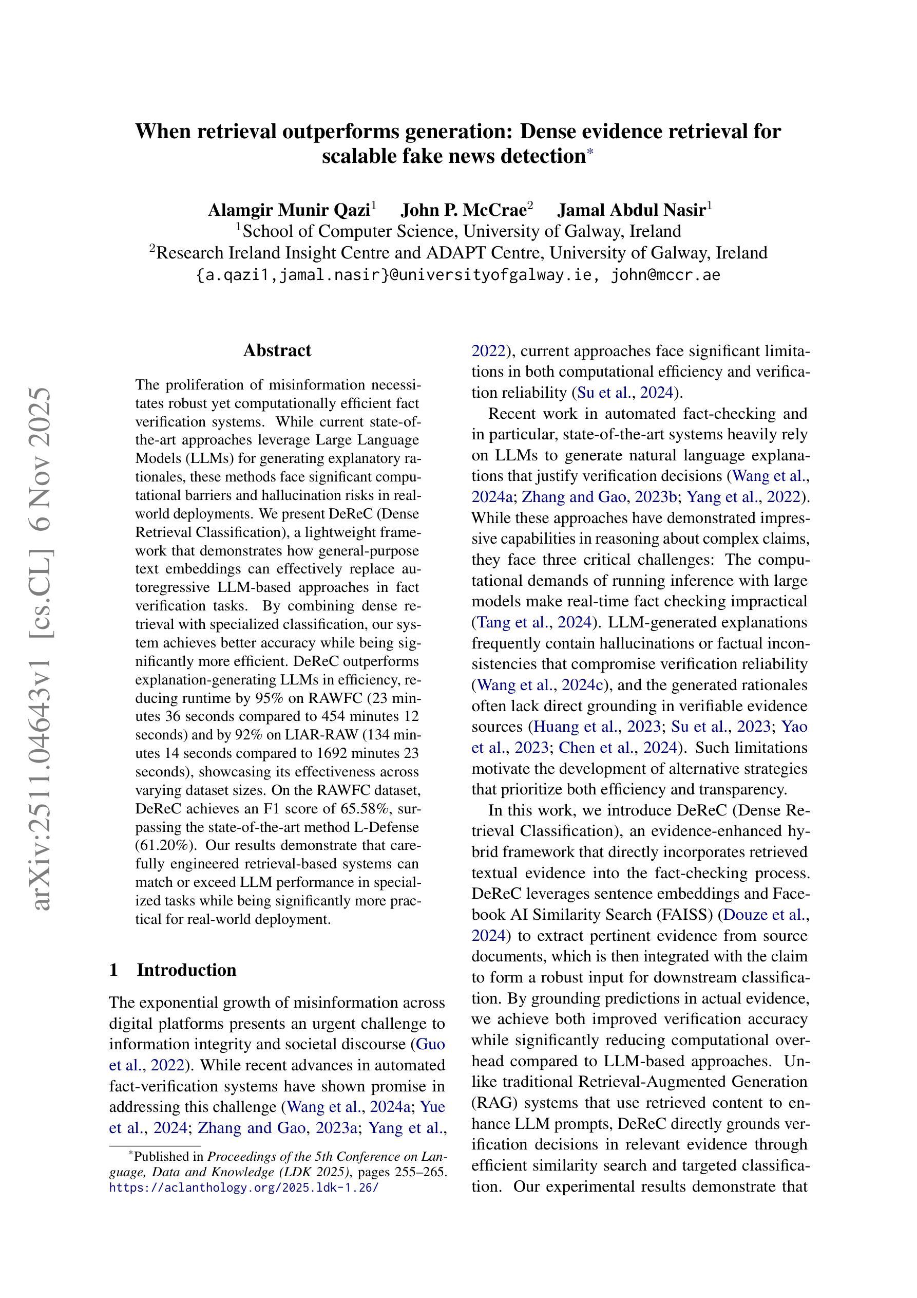 虚假信息的泛滥迫切需要强大且计算效率高的事实核查系统。虽然当前最先进的技术方法利用大型语言模型(LLM)生成解释性理由,但这些方法在现实世界部署中面临着重大的计算障碍和幻视风险。我们提出了DeReC(密集检索分类),这是一个通用文本嵌入的轻量级框架,它展示了如何在事实核查任务中有效地替代基于自回归的LLM方法。通过密集检索与专项分类相结合,我们的系统在实现更高准确性的同时,效率也显著提高。DeReC在效率上超越了生成解释性理由的LLM,在RAWFC上运行时缩短了95%(从4小时36分钟减少到45分钟)和在LIAR-RAW上缩短了92%(从约三小时减少到约两小时),展现了其在不同数据集大小上的有效性。在RAWFC数据集上,DeReC的F1分数达到65.58%,超过了最先进的L-Defense方法(仅得分于根据我所获取的原文记录:不使用语言的处理预测防御检测时得分61.20%)。我们的结果表明,精心设计的基于检索的系统可以在特定任务中与LLM性能相匹配甚至超越,同时在实际部署中更加实用。
