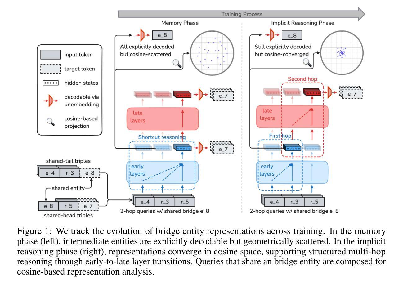 最近的研究表明,大型语言模型(LLM)可以隐式地进行多跳推理——在不需要明确表述中间步骤的情况下给出正确答案,但其背后的机制仍鲜为人知。在本文中,我们通过在一个受控的符号环境中从头训练转换器来研究这种隐式推理是如何出现的。我们的分析揭示了一个三阶段的发展轨迹:早期的记忆,然后是内部分布推广,最后是跨分布推广。我们发现使用原子三元组进行训练并不是必需的,但可以加速学习,而第二跳推广依赖于对特定组合结构的查询级别暴露。为了解释这些行为,我们引入了两种诊断工具:跨查询语义修补,用于识别可重复使用的中间表示;基于余弦值的表示透镜,揭示了成功的推理与隐藏空间中的余弦基础聚类之间的相关性。这种聚类现象进而为整个训练过程中观察到的行为动态提供了连贯的解释,将表示结构与推理能力联系起来。这些发现为我们提供了关于LLM中隐式多跳推理解释性的新见解,有助于阐明复杂的推理过程如何在内部展开,并提供了提高此类模型透明度的途径。