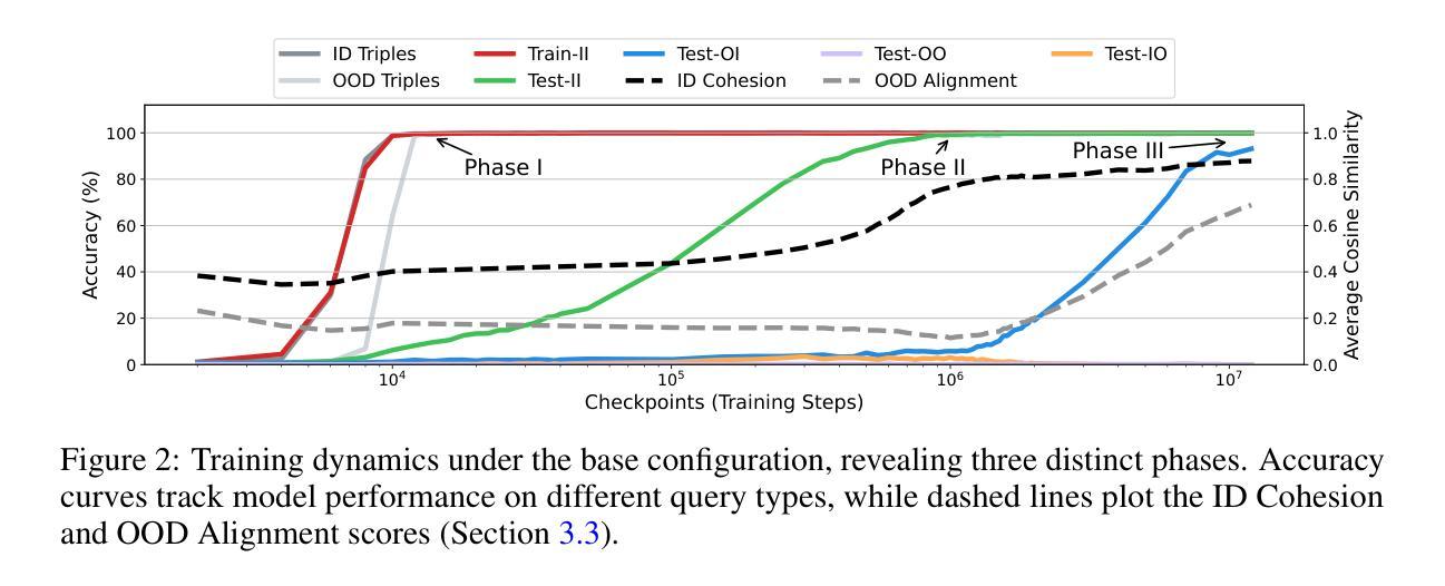 - 隐式推理的出现与在控制符号环境中训练变换器有关,经历了早期记忆、内部分布泛化和跨分布泛化三个阶段。