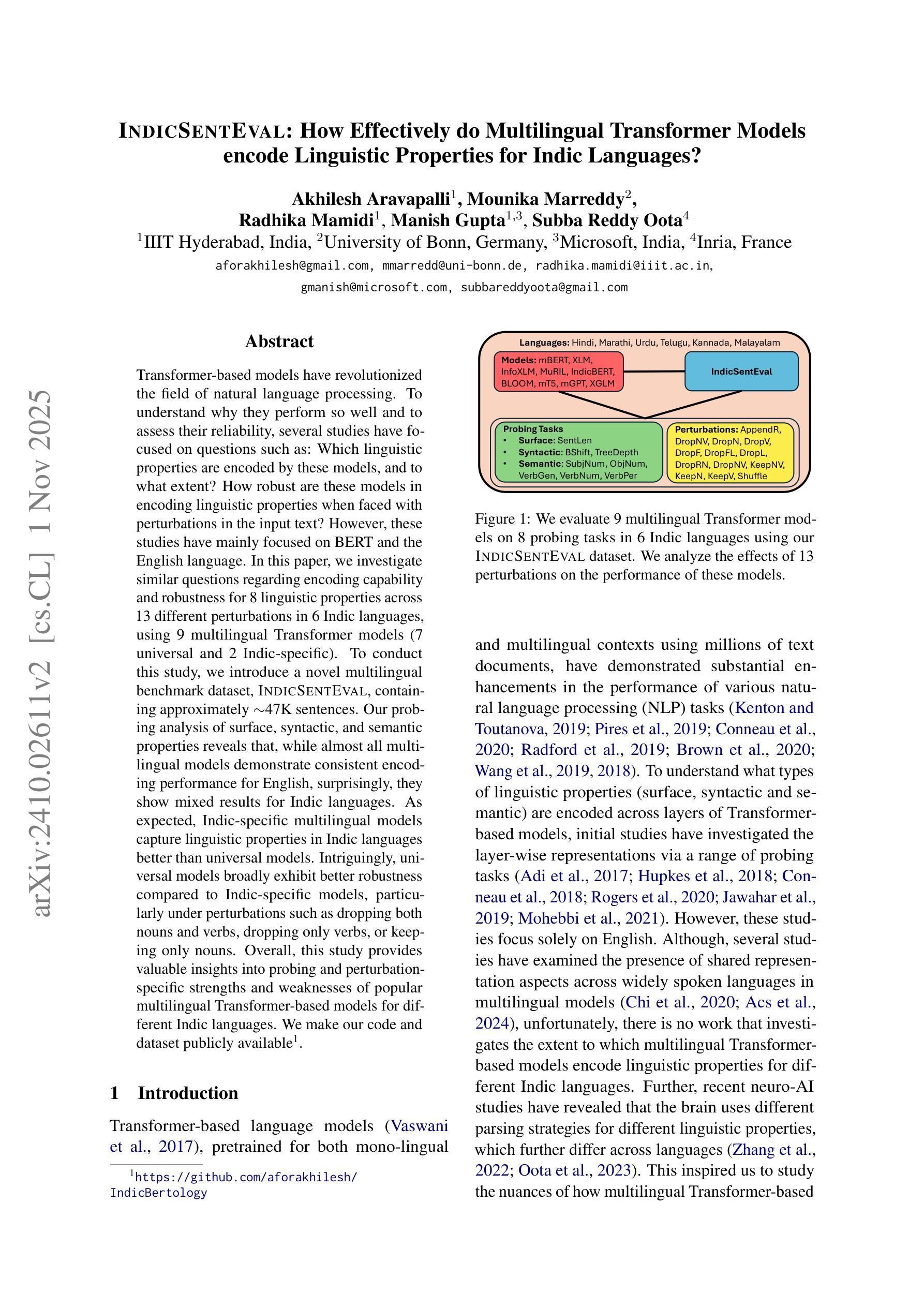 Transformer模型已经彻底改变了自然语言处理领域。为了更好地理解它们为何表现如此出色并评估其可靠性,多项研究专注于以下问题:这些模型编码了哪些语言特性,以及到了什么程度?当面对输入文本的扰动时,这些模型在编码语言特性方面的稳健性如何?然而,这些研究主要集中在BERT和英语上。在本文中,我们针对9种多语言Transformer模型(7种通用模型和2种印度语特定模型),研究关于编码能力和稳健性的相关问题,涉及6种印度语言的8种语言特性以及13种不同的扰动。为了进行这项研究,我们引入了一个新的多语言基准数据集IndicSentEval,包含约47K个句子。令人惊讶的是,我们对表层、句法层和语义特性的探查分析表明,几乎所有多语言模型在英语上的编码性能都表现一致,但在印度语上的表现却喜忧参半。正如预期那样,针对印度语的特定印度语多语言模型在捕捉印度语的语言特性方面比通用模型表现得更好。有趣的是,通用模型在大多数情况下表现出比印度语特定模型更好的稳健性,特别是在删除名词和动词、仅删除动词或仅保留名词等扰动情况下。总体而言,本研究为不同印度语流行的多语言Transformer模型在探查和特定扰动方面的优缺点提供了宝贵的见解。我们的代码和数据集已公开可用:[https://github.com/aforakhilesh/IndicBertology]。