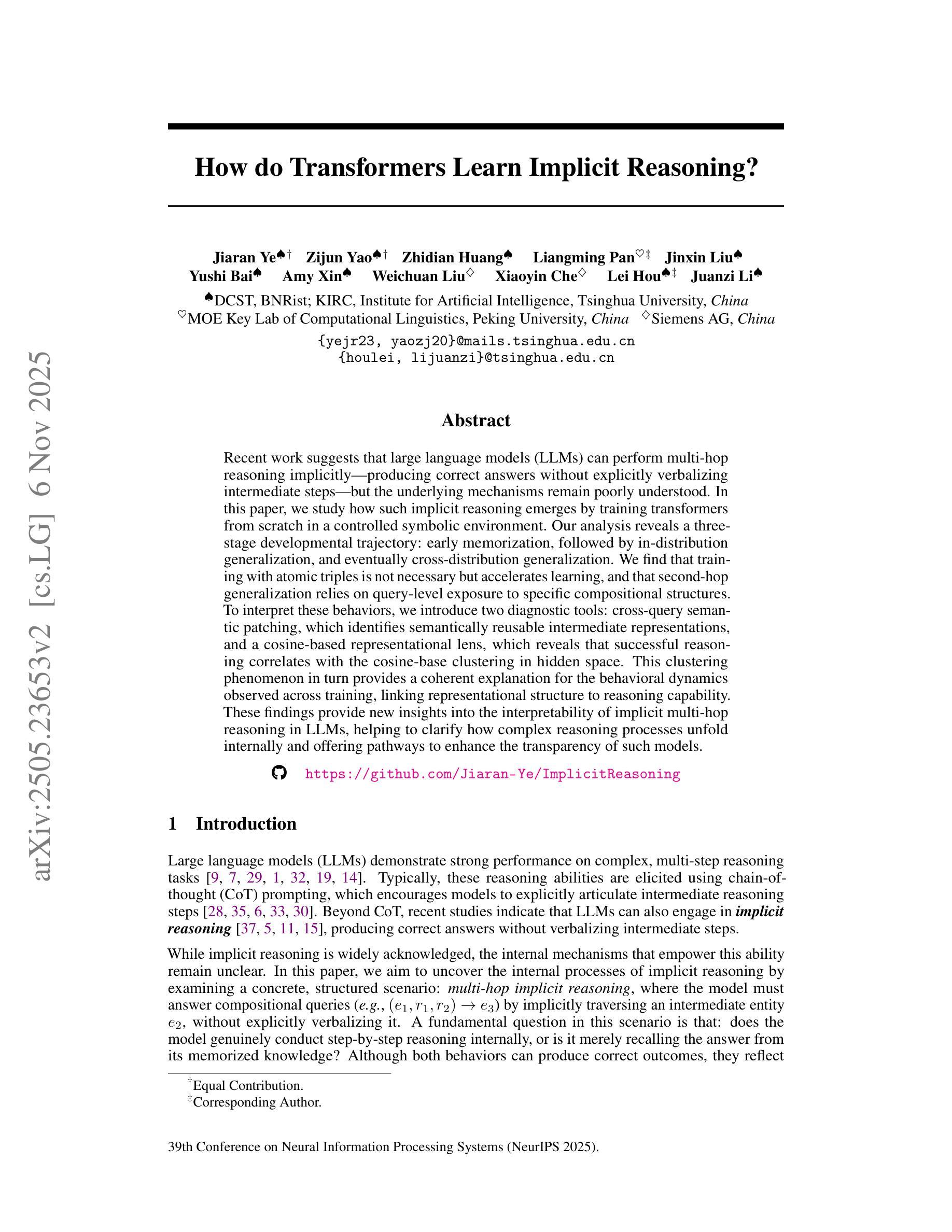 大型语言模型(LLM)能够隐式进行多跳推理,即产生正确答案而无需明确表述中间步骤。本研究通过在有控制符号的环境中从头训练变换器,探讨了这种隐式推理是如何出现的。分析揭示了三个发展阶段:早期记忆、内部分布泛化和跨分布泛化。研究发现,使用原子三元组进行训练并非必需,但可以加速学习,而第二跳泛化依赖于对特定组合结构的查询级暴露。为了解释这些行为,研究引入了两种诊断工具:跨查询语义补丁和基于余弦的代表透镜。这些发现揭示了隐式多跳推理在LLM中的可解释性,有助于阐明复杂的推理过程如何在内部展开,并为提高此类模型的透明度提供了途径。