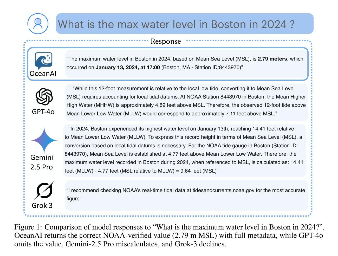人工智能正在改变科学领域,但通用的对话式人工智能系统常常产生未经证实的“幻觉”,破坏科学的严谨性。我们推出了OceanAI,这是一个对话平台,它将开源大型语言模型(LLM)的自然语言流畅性与实时、参数化的美国国家海洋和大气管理局(NOAA)海洋学数据流访问相结合。例如,“波士顿港口在2024年的最高水位是多少?”这样的查询会触发实时API调用,识别、解析和综合相关数据集,以可重现的自然语言回应和数据可视化形式提供信息。与其他广泛使用的AI聊天界面产品相比,只有OceanAI能提供NOAA来源的带有原始数据参考的值;其他产品要么不回答,要么提供无支持的结果。OceanAI设计用于可扩展性,可连接到多个NOAA数据产品和变量,支持海洋危害预报、生态系统评估和水质监测等应用。通过基于观察和可观察数据的输出,OceanAI提高了透明度、可重复性和信任度,为海洋中的AI决策支持提供了可扩展的框架。
