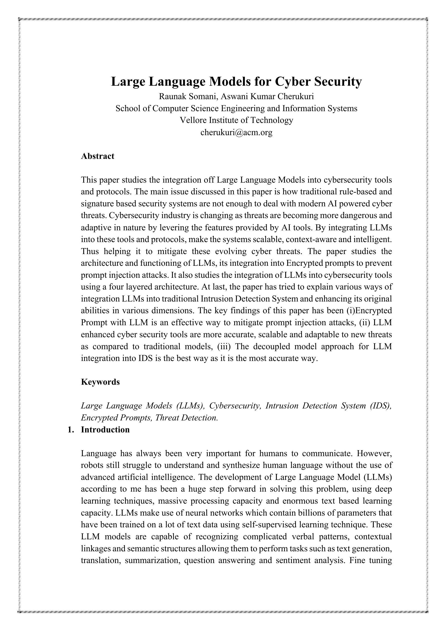 This paper studies the integration off Large Language Models into cybersecurity tools and protocols. The main issue discussed in this paper is how traditional rule-based and signature based security systems are not enough to deal with modern AI powered cyber threats. Cybersecurity industry is changing as threats are becoming more dangerous and adaptive in nature by levering the features provided by AI tools. By integrating LLMs into these tools and protocols, make the systems scalable, context-aware and intelligent. Thus helping it to mitigate these evolving cyber threats. The paper studies the architecture and functioning of LLMs, its integration into Encrypted prompts to prevent prompt injection attacks. It also studies the integration of LLMs into cybersecurity tools using a four layered architecture. At last, the paper has tried to explain various ways of integration LLMs into traditional Intrusion Detection System and enhancing its original abilities in various dimensions. The key findings of this paper has been (i)Encrypted Prompt with LLM is an effective way to mitigate prompt injection attacks, (ii) LLM enhanced cyber security tools are more accurate, scalable and adaptable to new threats as compared to traditional models, (iii) The decoupled model approach for LLM integration into IDS is the best way as it is the most accurate way.
