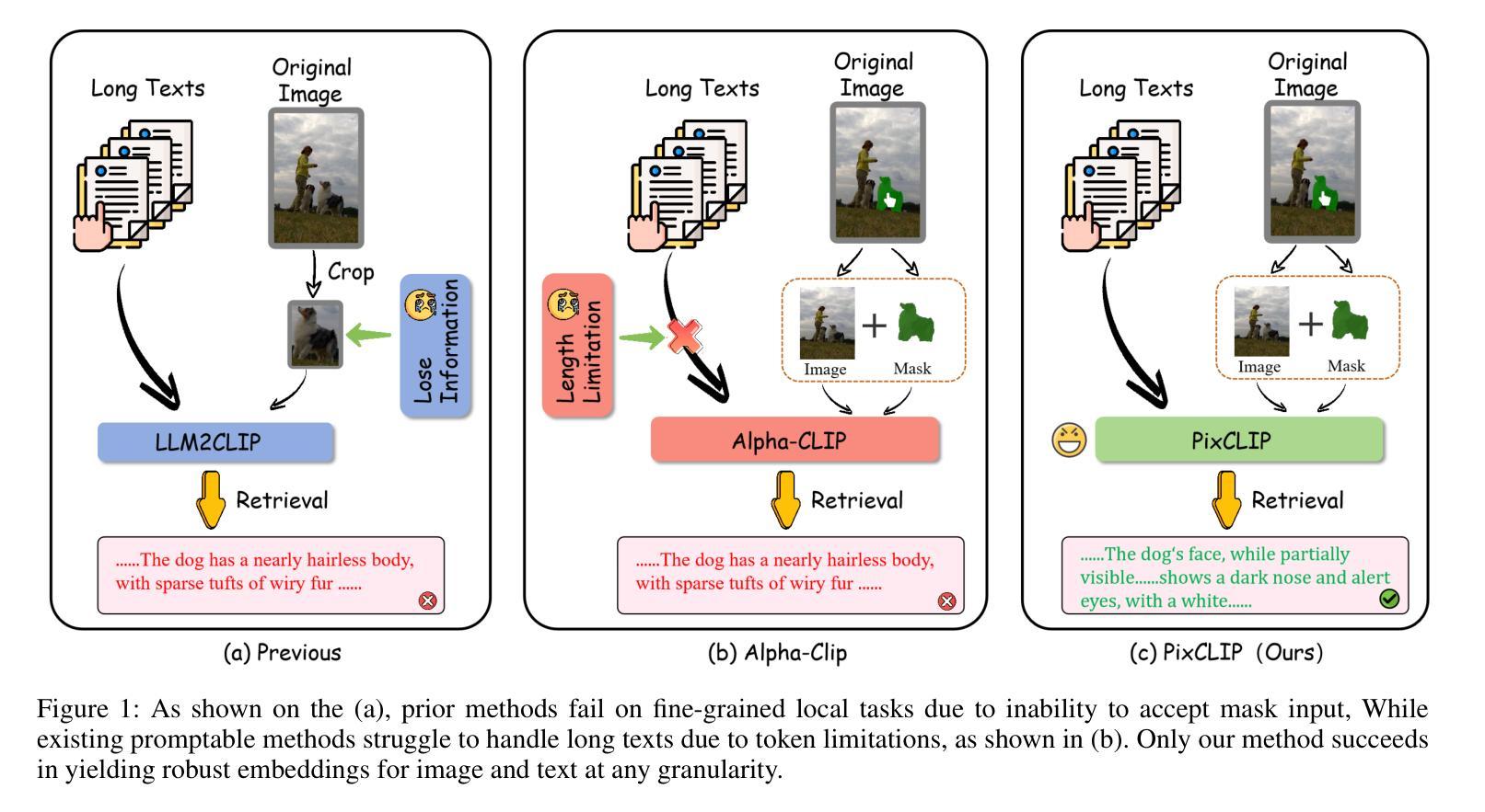 对比语言图像预训练(CLIP)模型在各种下游视觉语言理解任务中取得了显著的成功,但提高其精细粒度图像文本对齐能力仍是活跃的研究焦点。为此,大多数现有工作采用明确提高视觉信息处理粒度的策略,例如,融入视觉提示来引导模型关注图像内的特定局部区域。同时,多模态大型语言模型(MLLM)的研究表明,使用长而详细的文本描述进行训练可以有效地提高模型的精细视觉语言对齐能力。然而,CLIP文本编码器的固有令牌长度限制从根本上限制了CLIP处理嵌入在长文本序列中的更精细的文本信息的能力。为了协同利用提高视觉和文本内容处理粒度的优势,我们提出了PixCLIP,这是一个新颖框架,旨在同时接受视觉提示输入并处理冗长的文本描述。具体来说,我们首先建立了一个自动化注释管道,能够生成像素级的局部化长文本图像描述。利用此管道,我们构建了LongGRIT数据集,这是一个高质量的数据集,包含近150万个样本。其次,我们替换了CLIP的原始文本编码器为大型语言模型,并提出了一种三支像素文本对齐学习框架,促进图像区域和相应文本描述之间在任意粒度上的精细对齐。实验表明,PixCLIP在像素级交互和处理长文本方面取得了突破,达到了最先进的性能。