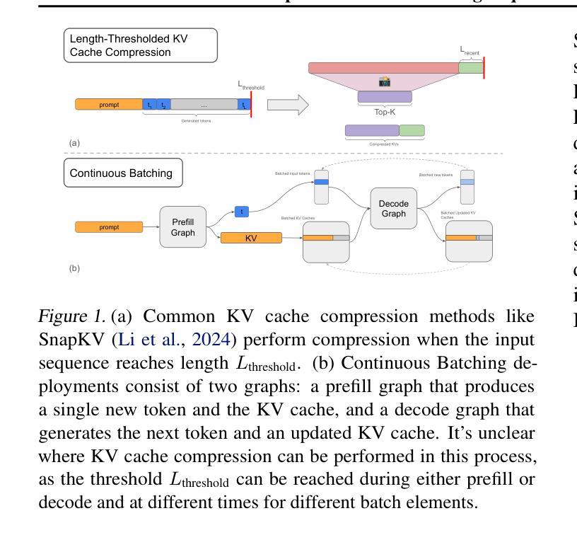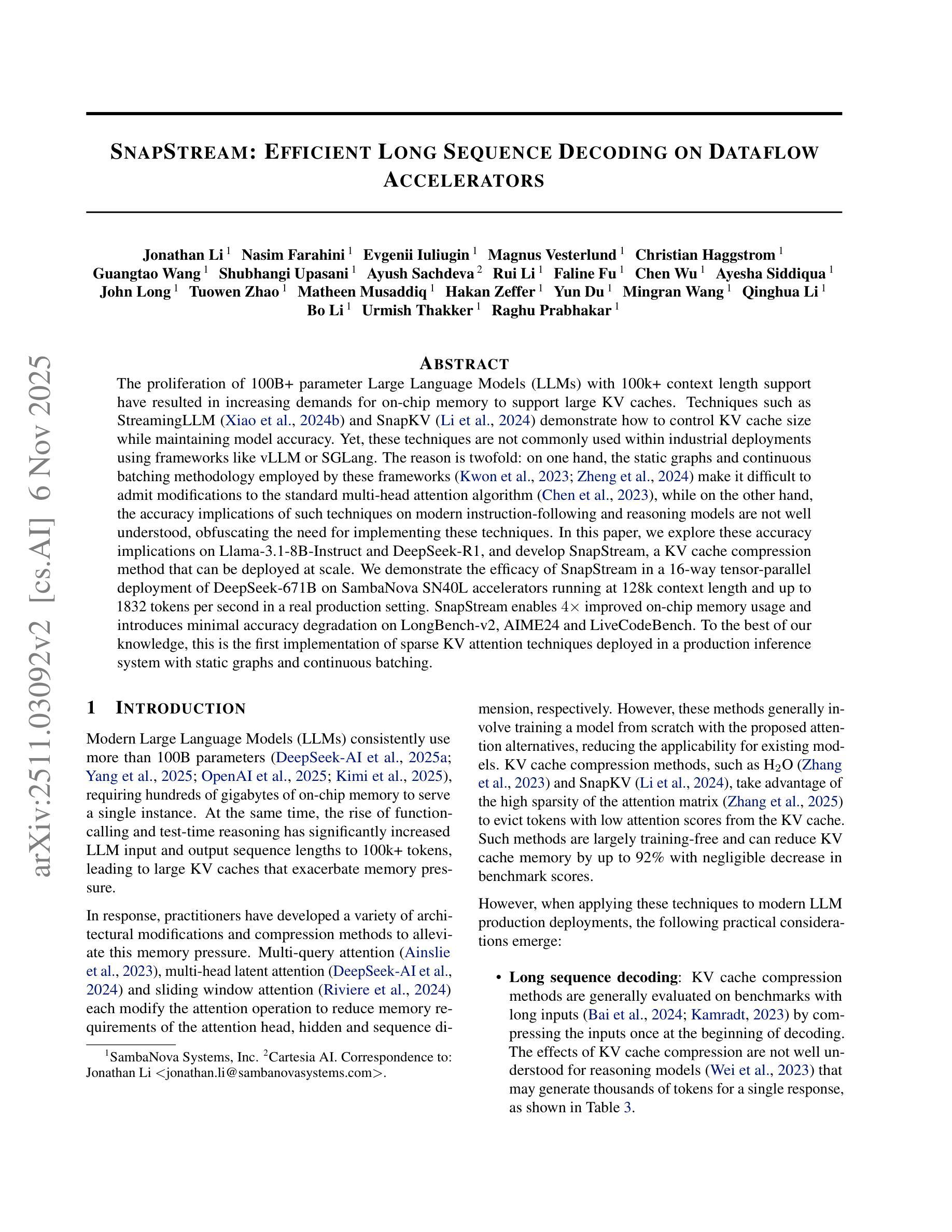 随着支持超过百亿参数的大型语言模型(LLM)和超过十万上下文长度的支持越来越多,对芯片内存的需求也在不断增加,以支持大规模的KV缓存。StreamingLLM和SnapKV等技术展示了如何在保持模型准确性的同时控制KV缓存大小。然而,这些技术在工业部署中并不常用,特别是在使用vLLM或SGLang等框架的情况下。原因有两方面:一方面,这些框架采用的静态图和连续批处理方法使得难以对标准多头注意力算法进行修改;另一方面,这些技术对现代指令遵循和推理模型的准确性影响尚不清楚,这使得实现这些技术的必要性变得模糊。在本文中,我们探讨了这些准确性影响在Llama-3.1-8B-Instruct和DeepSeek-R1上的表现,并开发了SnapStream,这是一种可大规模部署的KV缓存压缩方法。我们在实际生产环境中展示了SnapStream在DeepSeek-671B的16路张量并行部署中的有效性,该环境运行在SambaNova SN40L加速器上,上下文长度为128k,每秒可处理高达1832个令牌。SnapStream在LongBench-v2、AIME24和LiveCodeBench上的准确率略有下降,但在芯片内存使用上提高了四倍。据我们所知,这是首个在具有静态图和连续批处理的生产推理系统中部署稀疏KV注意力技术的实现。
