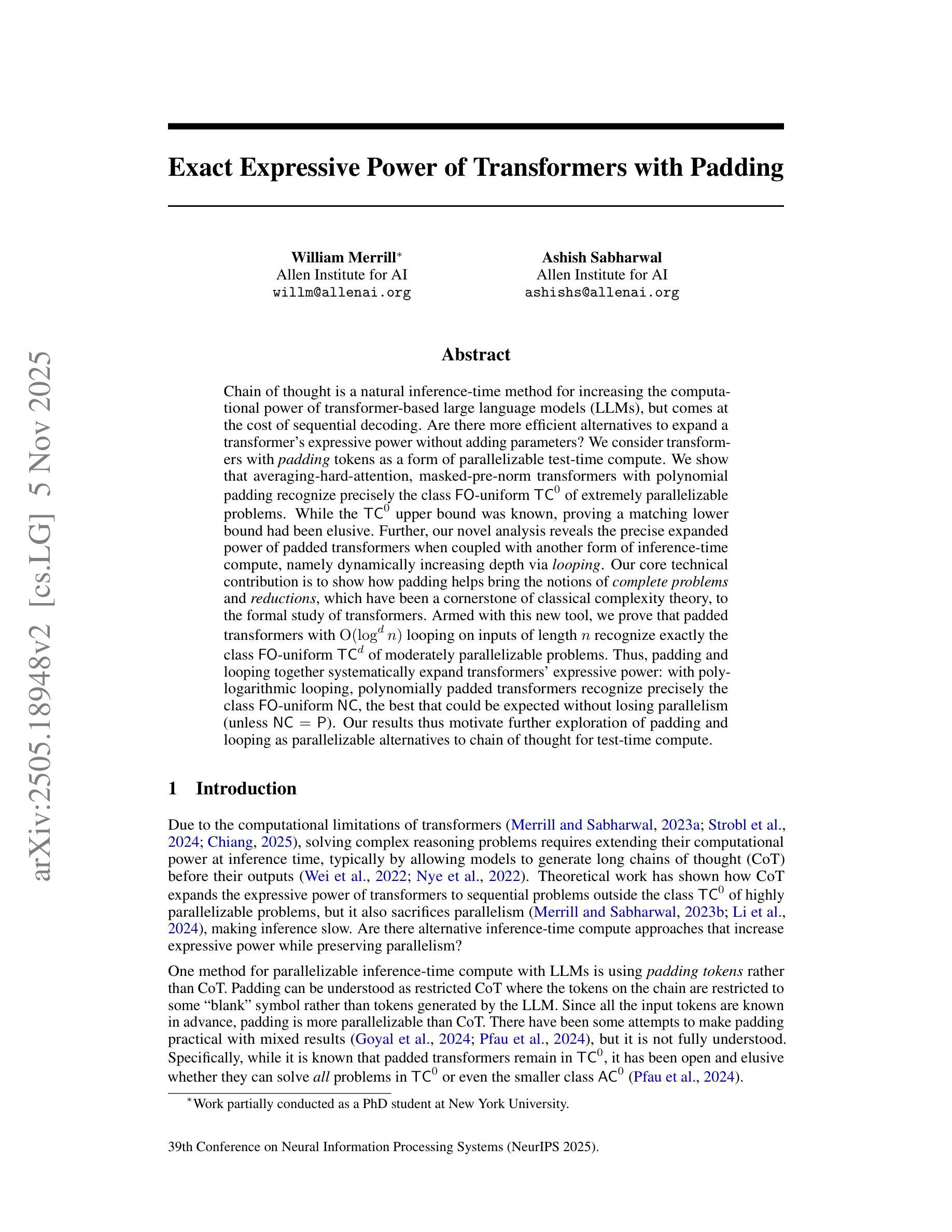 Chain of thought is a natural inference-time method for increasing the computational power of transformer-based large language models (LLMs), but comes at the cost of sequential decoding. Are there more efficient alternatives to expand a transformer’s expressive power without adding parameters? We consider transformers with padding tokens as a form of parallelizable test-time compute. We show that averaging-hard-attention, masked-pre-norm transformers with polynomial padding recognize precisely the class $\mathsf{FO}$-uniform $\mathsf{TC}^0$ of extremely parallelizable problems. While the $\mathsf{TC}^0$ upper bound was known, proving a matching lower bound had been elusive. Further, our novel analysis reveals the precise expanded power of padded transformers when coupled with another form of inference-time compute, namely dynamically increasing depth via looping. Our core technical contribution is to show how padding helps bring the notions of complete problems and reductions, which have been a cornerstone of classical complexity theory, to the formal study of transformers. Armed with this new tool, we prove that padded transformers with $O(\log^d n)$ looping on inputs of length $n$ recognize exactly the class $\mathsf{FO}$-uniform $\mathsf{TC}^d$ of moderately parallelizable problems. Thus, padding and looping together systematically expand transformers’ expressive power: with polylogarithmic looping, polynomially padded transformers recognize precisely the class $\mathsf{FO}$-uniform $\mathsf{NC}$, the best that could be expected without losing parallelism (unless $\mathsf{NC} = \mathsf{P}$). Our results thus motivate further exploration of padding and looping as parallelizable alternatives to chain of thought for test-time compute.