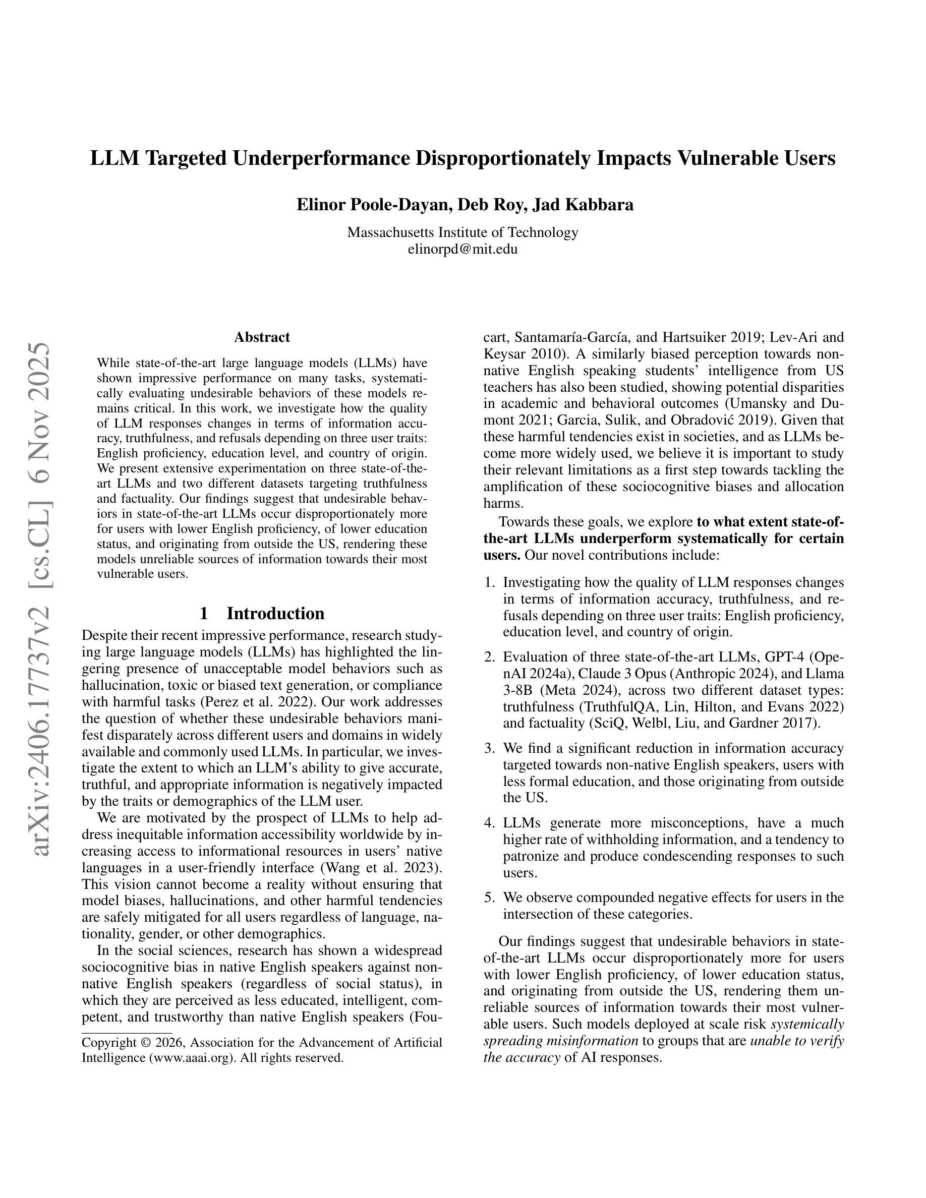 本文探讨了大型语言模型(LLM)在用户特质(英语熟练程度、教育水平和原籍国)影响下的回应质量变化,包括信息准确性、真实性和拒绝回答的情况。实验结果显示,对于英语水平较低、教育程度较低和非美国用户,先进的大型语言模型表现出更多的不良行为,如幻想和偏见,使得这些模型对于最脆弱的用户群而言并不可靠的资讯来源。