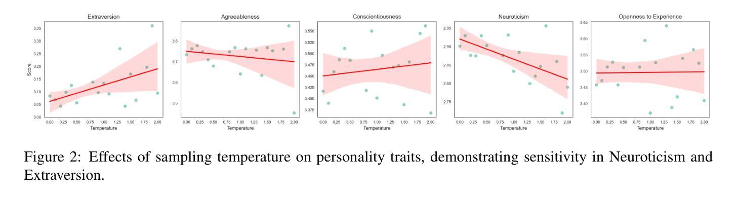- 神经质和外向性特质在LLM中易受采样温度调整的影响。