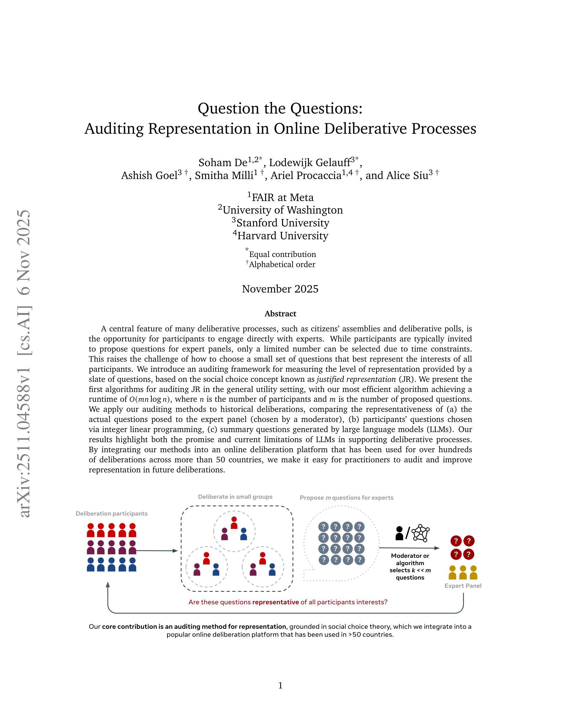 许多审议过程(如公民大会和审议性民意调查)的核心特点是参与者有机会直接与专家进行交流。虽然参与者通常受邀为专家小组提出问题,但由于时间限制,只能选出有限的问题。这就提出了如何选出最能代表所有参与者利益的一小批问题的挑战。我们引入了一个审计框架,基于被称为合理代表性(JR)的社会选择概念,来衡量一组问题的代表性水平。我们提供了在一般效用环境下对JR进行审计的第一批算法,我们最高效的算法达到了O(mnlogn)的运行时间,其中n是参与者的数量,m是提出的问题的数量。我们将审计方法应用于历史审议,比较了(a)专家小组实际面临的问题(由主持人选择)、(b)通过整数线性规划选择的参与者问题、(c)由大型语言模型(LLM)生成的问题摘要的代表性。我们的结果既展示了大型语言模型在支持审议过程中的潜力,也指出了其当前存在的局限性。通过将我们的方法整合到一个已在全球超过五十个国家用于数百次审议的在线审议平台中,我们使从业者能够轻松审计和改进未来审议中的代表性。