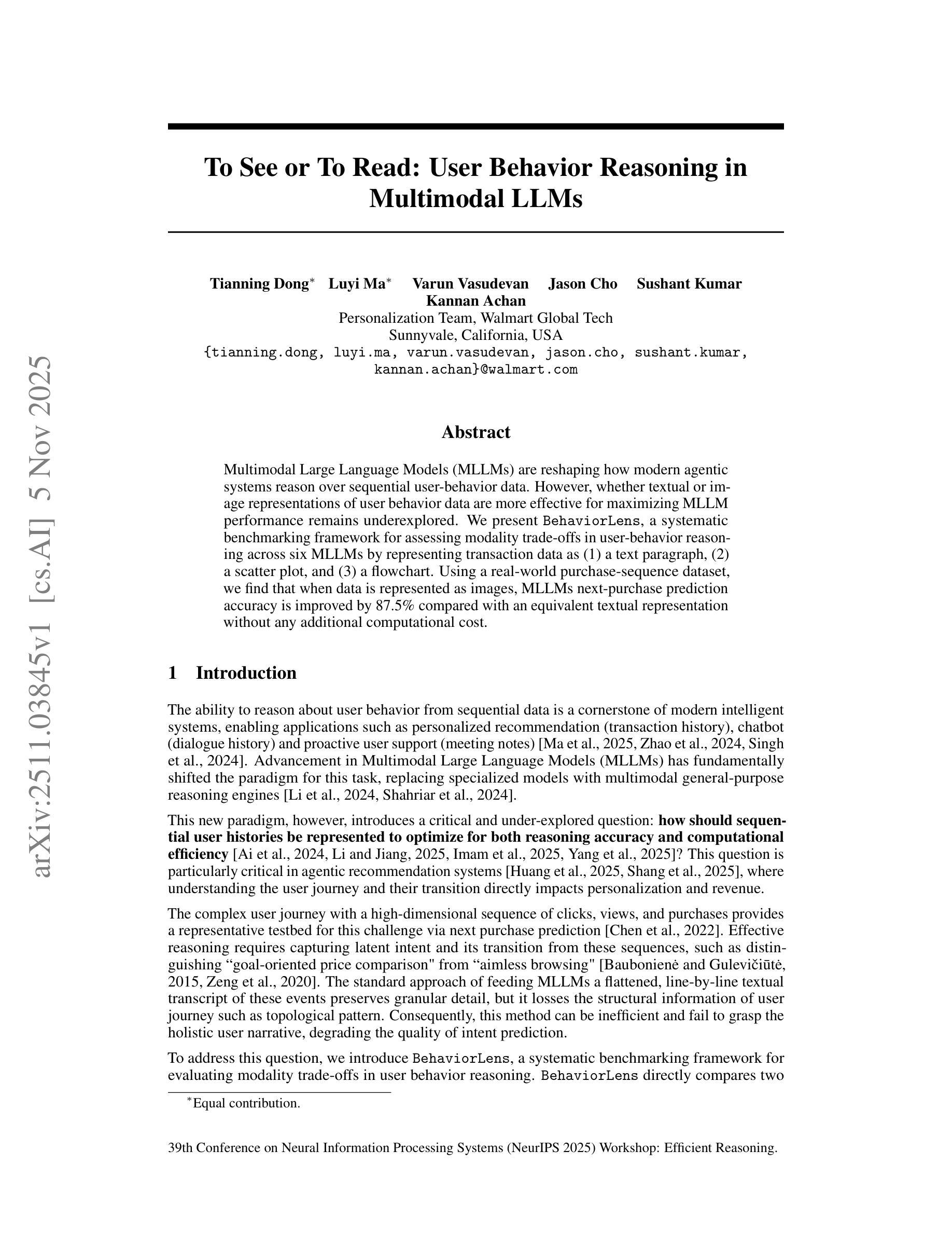 Summary:多模态大型语言模型(MLLMs)正在改变现代代理系统对用户行为数据的序列化推理方式。然而,关于用户行为数据的文本表示和图像表示在最大化MLLM性能方面哪个更有效尚未得到充分探索。本研究提出了一个名为BehaviorLens的系统性评估框架,通过对交易数据以文本段落、散点图和流程图三种方式进行呈现,评估用户行为推理中的模态权衡问题。使用真实购买序列数据集发现,将数据以图像形式呈现,MLLMs的下次购买预测准确度提高了87.5%,且无需增加计算成本。