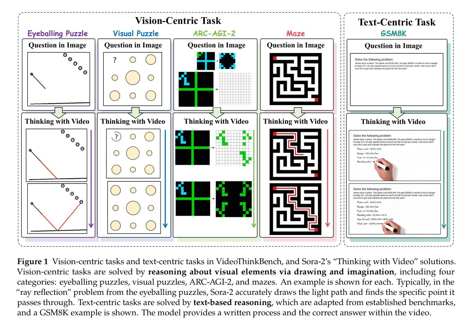 “文字思考”和”图像思考”范式显著提高了大型语言模型(LLM)和视觉语言模型(VLM)的推理能力。然而,这些范式存在固有局限性。(1)图像只能捕捉瞬间,无法表示动态过程或连续变化;(2)文字和视觉作为不同的模态被分隔开来,阻碍了统一的多模态理解和生成。为了克服这些局限性,我们引入了“视频思考”这一新范式,它利用视频生成模型(如Sora-2)在统一的时间框架内桥接视觉和文本推理。为了支持这一探索,我们开发了视频思考基准测试(VideoThinkBench)。VideoThinkBench包含两个任务类别:(1)以视觉为中心的任务(例如,眼球测验),以及(2)以文本为中心的任务(例如,GSM8K的子集,MMMU)。我们的评估证明Sora-2是一个能胜任的推理者。在以视觉为中心的任务中,Sora-2通常与最先进的技术(SOTA)VLM相当,甚至在几个任务上超过了VLM,如眼球游戏。在以文本为中心的任务中,Sora-2在MATH上达到92%的准确率,在MMMU上达到75.53%的准确率。此外,我们还系统地分析了这些能力的来源。我们还发现自我一致性(self-consistency)和上下文内学习(in-context learning)可以提高Sora-2的性能。总之,我们的研究结果表明,视频生成模型是潜在的一体化多模态理解和生成模型,”视频思考”是一种统一的多模态推理范式。