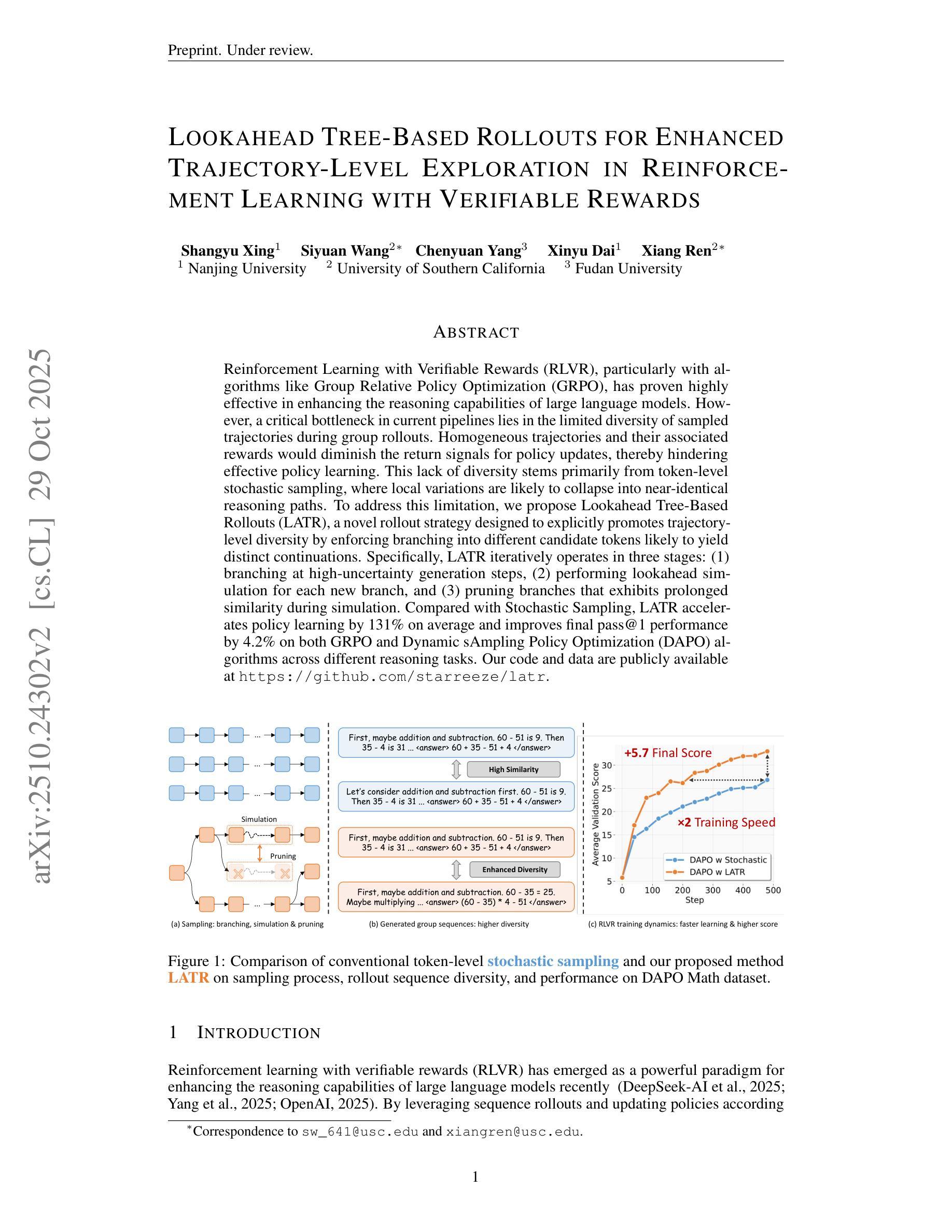 强化学习与可验证奖励(RLVR)结合,如集团相对政策优化(GRPO)等算法,能有效提升大型语言模型的推理能力。然而,当前管道的关键瓶颈在于群体滚动过程中采样轨迹的多样性有限。同质的轨迹及其相关奖励会降低策略更新的回报信号,阻碍有效的策略学习。针对这一问题,我们提出了基于前瞻树的滚动(LATR)策略,旨在通过强制分支到不同的候选令牌来明确促进轨迹级别的多样性,从而产生不同的延续。LATR通过三个阶段操作:一是在高不确定性生成步骤进行分支;二是对每个新分支进行前瞻模拟;三是删除模拟过程中长时间相似的分支。相较于随机采样,LATR平均加速策略学习131%,最终通过一次执行成功率的性能提高了4.2%,无论是在GRPO还是动态采样政策优化(DAPO)算法中,均应用于不同的推理任务。相关代码和数据已在公开平台发布。